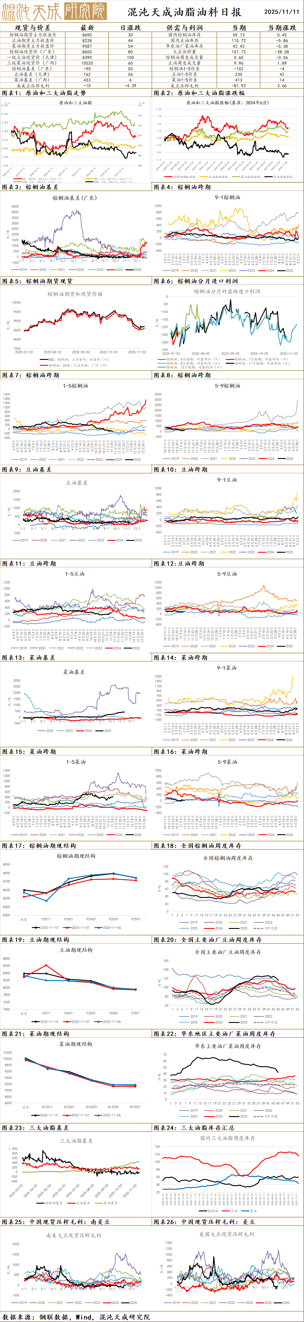需求端:SEA发布的贸易预估数据显示,印度10月棕榈油进口降至五年低位;多个矿业协会正在请求印度尼西亚政府取消在2026年实施50%混合生物柴油(B50)的计划,引发市场对B50计划的顺利实施和棕榈油未来需求的担忧;10月27日,包括棕榈油和可可产品在内,美国决定将1711种马来西亚出口产品的关税降至19%以下,预计此举将增强马来西亚商品在美国市场的价格竞争力;印度溶剂萃取商协会(SEA)公布的数据显示:印度9月食品级植物油进口量为160.46万吨,棕榈油进口为82.9万吨,较8月的99.05万吨减少16.30%,9月印度棕榈油进口量下滑至5月以来最低水平,预计10月排灯节过后采购需求将持续下降;EPA 正在制定关于 SRE 重新分配的规则,这将推迟其对 2026 年和 2027 年强制要求的决定,预计2026 年的最终强制要求要到新年之后才能出台,关于小型炼厂义务重新分配的时间可能推迟;马来年底前启动可持续航空燃料生产、国内消费预期增加;据巴西国家能源政策委员会(CNPE)官员,巴西将生物柴油在柴油中的强制掺混比例从14%上调至15%;昨日新增买船0条,本周累计买船0条,上周国内棕榈油库存环比增加0.8%。