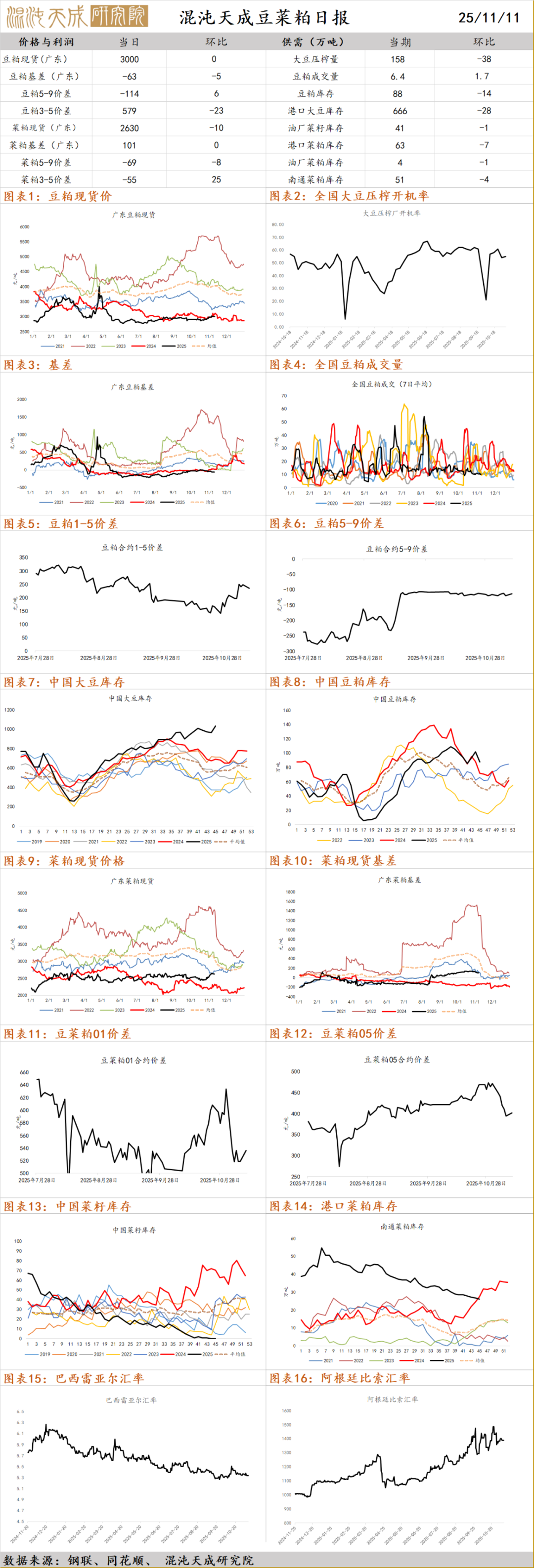 供需数据:上周国内主要油厂大豆压榨量大幅回落、不及预期。监测显示,截至 11 月 7 日当周,国内主要油厂大豆压榨量 181万吨,周环比下降 45 万吨,月环比上升 52 万吨,同比下降 6 万吨,较过去三年同期均值上升 5 万吨。预计本周油厂开机率小幅回升,压榨量在 215 万吨左右。