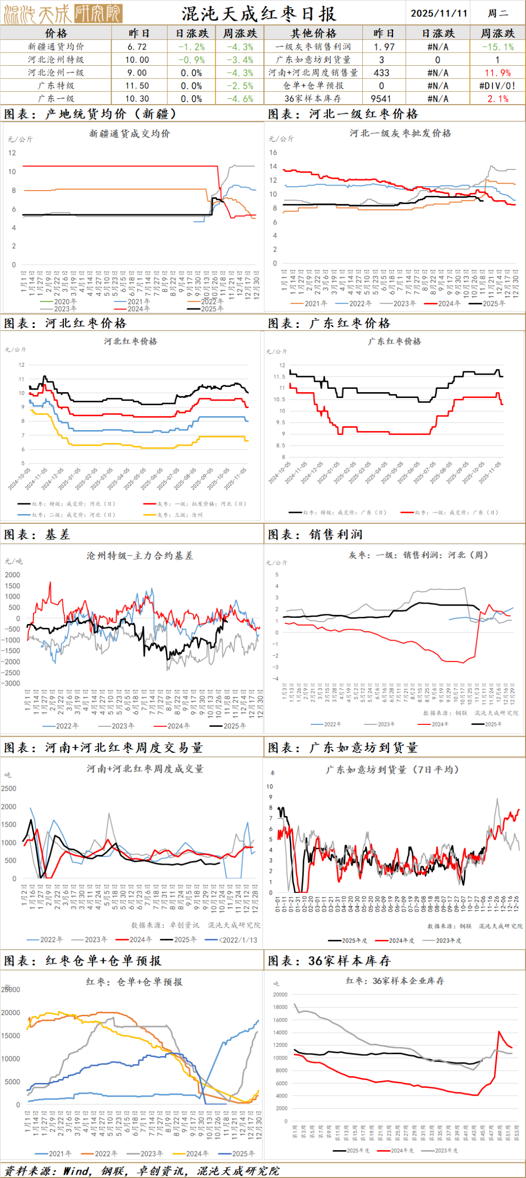 河北崔尔庄市场停车区到货6车,价格趋弱运行,新季成品上市少量价格松动; 广东如意坊市场到货3车,价格暂稳运行,下游客商采购积极性一般,成交1车左右;盘面大跌后低位震荡,前期锁定的陈枣逐步流出,按照盘面-600至-1000元/吨的价格出售,陈枣现货抛售压力增大,收购价格预计会进一步回落;今年整体产量维持55万吨±5万吨的观点,整体供需过剩比较明确,目前盘面已经大幅下跌,维持反弹逢高空的策略。