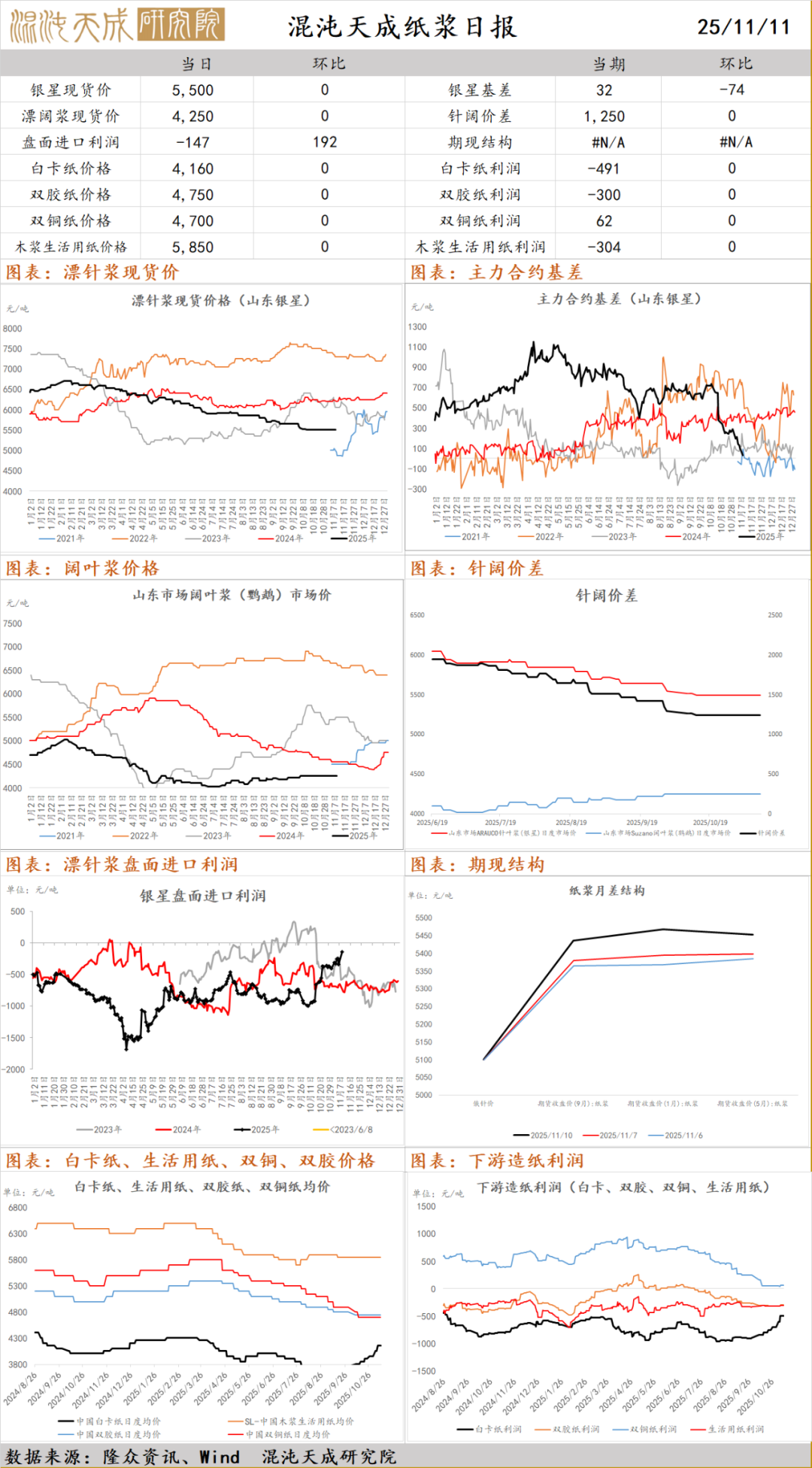 纸浆:昨日国内针叶浆现货稳定,银星5500元/吨(0),俄针5100元/吨(0);阔叶浆现货稳定,金鱼4250元/吨(0);针阔叶浆价差1250元/吨(0),现货市场交投一般;白卡纸市场行情波动不大,业者观望为主;生活用纸市场价格以稳为主,市场交投活跃度变化不大;文化用纸市场新增装置生产趋稳,纸张供应过剩情况较为严峻;受低价仓单不足影响,主力合约涨幅扩大;行业基本面没有明显改观,需求改善不显著,现货疲软的态势并无根本扭转,关注纸厂补库和仓单数量变动,远期合约不宜过度看空。