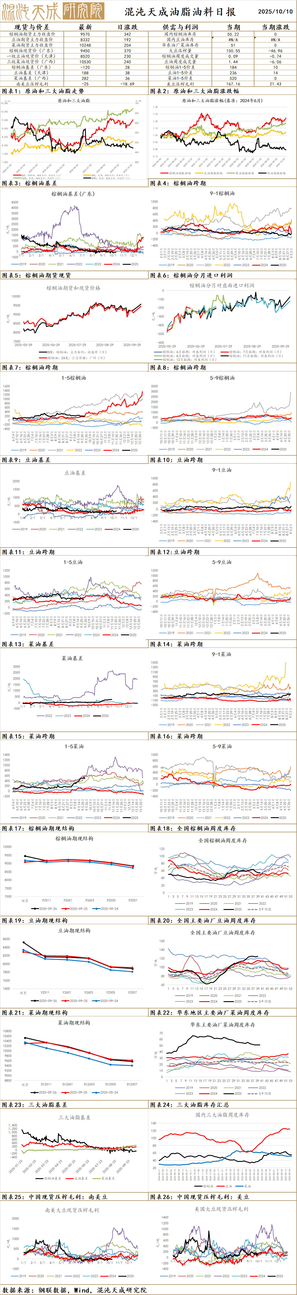 供给端:路透调查显示,预计马来西亚2025年9月棕榈油库存为215万吨,比8月下降2.5%,为七个月来首次下滑;产量预计为179万吨,比8月下降3.3%,触及6月以来的最低水平;出口量预计为143万吨,比8月增长7.7%;马来西亚棕榈油协会(MPOA)发布的数据,马来西亚9月1-30日棕榈油产量预估减少2.35%,其中马来半岛减少6.17%,沙巴增加2.35%,沙捞越增加6.62%,东马来西亚增加3.44%,预估9月马来西亚棕榈油总产量为181万吨;印度尼西亚(Gapki)的数据:印尼7月棕榈油产量6月的528.9万吨上升至560.6万吨,出口量从6月份的360.6万吨下降至353.7万吨,库存从 6月的253万吨上升至256.8万吨;马来西亚棕榈油局(MPOB)公布了马棕8月数据:8月马棕产量185.5万吨,环比增加2.35%,出口132.5万吨,环比减少0.29%,机构预估出口145万吨,实际公布的出口量小于预期,月马棕表需49万吨,几乎是单月最高表需,最终马棕库存220.25万吨,环比增加4.18%,和预期一致;印尼林业小组计划从9月1日起,对约427万公顷(1.055万英亩)林区内未获得许可运营的矿山进行打击,工作小组已经于3月启动了所谓的“纪律行动”,打击非法棕榈油生产,并派遣军方人员接管了逾330万公顷种植园。