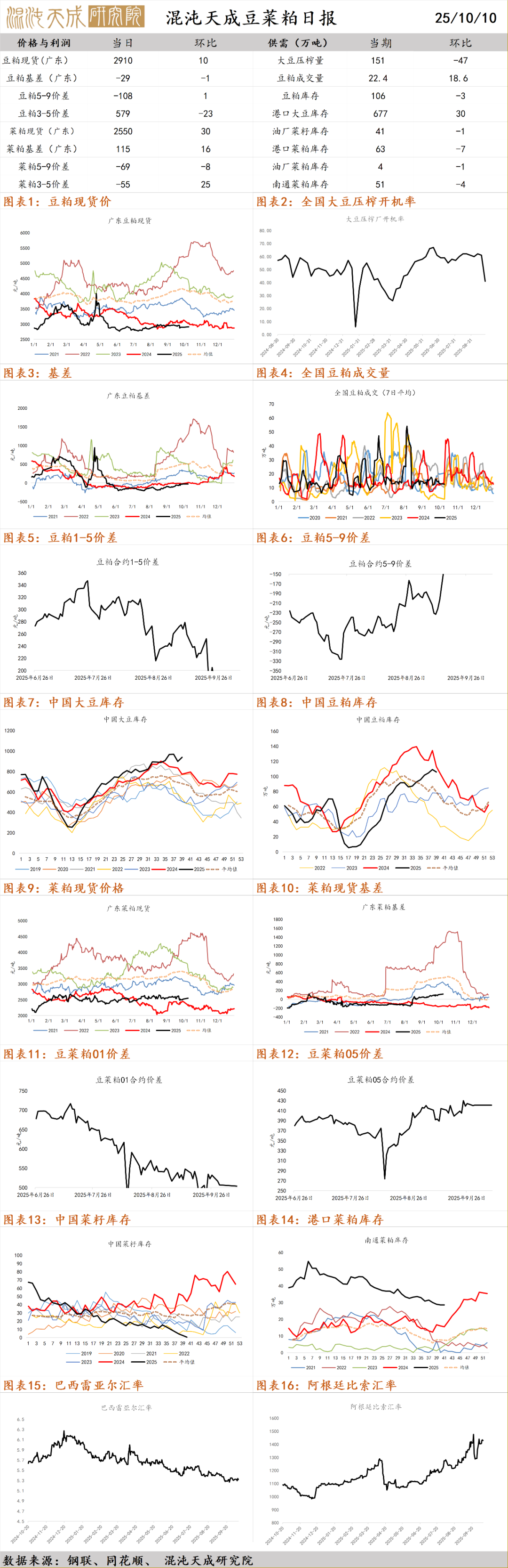 供给端:美国总统特朗普在社交媒体TruthSocial上表示,他将在四周后与中国国家主席会晤,大豆将是讨论重点之一;路透公布对USDA 10月供需报告中美国农作物产量的数据预测,分析师平均预计美国2025/26年度大豆产量料为42.71亿蒲式耳,预估区间介于42-43.36亿蒲式耳,USDA此前在9月预估为43.01亿蒲式耳,美国2025/26年度大豆期末库存为2.99亿蒲式耳,预估区间介于2.3-4.27亿蒲式耳,USDA此前在9月预估为3亿蒲式耳;截至10月2日,2025/26年度大豆播种进度达到全国总播种面积的9%,高于一周前的3.2%,也高于去年同期的4%。