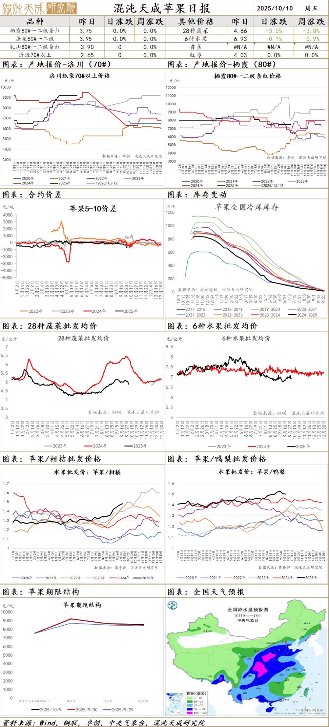 苹果:新季晚熟富士陆续供应市场,今年各产区表现差异明显,陕西果个偏小,山东产区果锈偏多,甘肃产区冰雹点高于往年,近期降雨频繁,苹果上色难度比较大,上市时间推迟10天左右;客商采购意愿尚可,主要选购质量较好的货源,订货价格居高,洛川产区近期70#起步主流订货价格3.5-4.0元/斤,好货4.0-4.5元/斤;产地收购期缩短,收购氛围浓厚,天气影响仍存,短期仍偏强看待,后期关注收购价格的变动和入库情况。