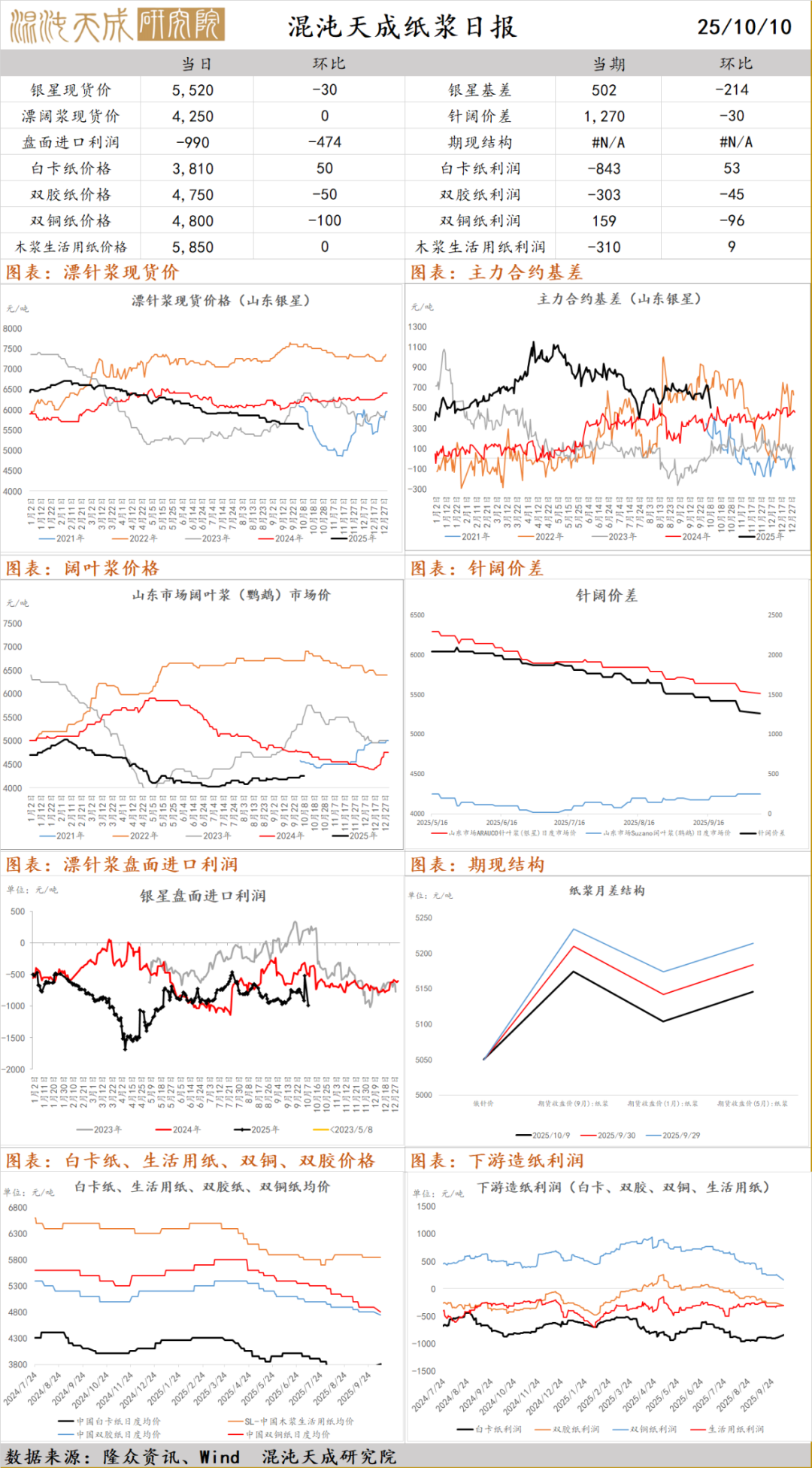 纸浆:昨日国内针叶浆现货小幅下跌,银星5520元/吨(-30),俄针5050元/吨(-50);阔叶浆现货稳定,金鱼4250元/吨(0);针阔叶浆价差1270元/吨(-30),现货市场交投一般;白卡纸市场交投逐渐恢复,市场低价上涨,高价下调;生活用纸市场价格平稳运行,市场交投活跃度变化不大,场内暂无利好支撑;文化用纸市场淡稳续市,散单成交为主;本周国内纸浆主流港口样本库存量为207.7万吨,较上期累库4.4万吨,环比上升2.2%;本周下游开工,白卡纸环比+0.0%,双胶纸环比-7.4%,铜版纸环比-13.4%,生活纸环比-0.1%;盘面大幅下探,供需边际改善有限,布针仓单对盘面价格仍有压制;行业基本面没有明显改观,整体旺季不旺,上方有一定压力,下方有成本支撑,关注重要纸厂停产情况和政策影响持续性。