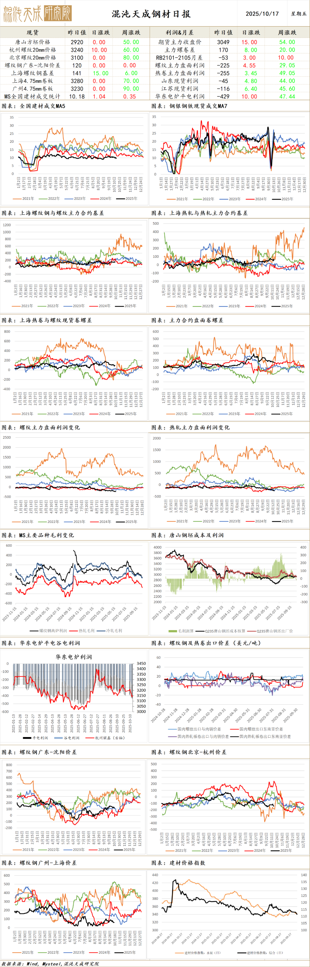 需求端,昨日钢联五大材厂库、社库均有减量,总库存有小幅下降,此前找钢的钢材厂库、社库延续增长,但总库存增幅有所放缓。不过,本周机构数据均显示钢材表需有明显回升。另据百年建筑调研,本周全国水泥出库量252.85万吨,环比上升7.7%,基建水泥直供量环比上升4%;混凝土发运量为149.68万方,环比增加3.04%;样本建筑工地资金到位率59.44%,周环比减0.1个点,显示当前建筑下游需求依然喜忧参半。海外方面,美国政府停摆延续,美债规模继续上升,叠加当前中美贸易博弈不确定性增大,近日贵金属持续走强,外盘商品走势大幅波动。国内方面,近日发改委印发《节能降碳中央预算内投资专项管理办法》,支持钢铁等行业节能降碳改造,中钢协座谈会也强调“十五五”期间产量调控将向碳排放调控过渡,国内政策预期依然向好,但受中美博弈升级影响,短期国内商品氛围依然偏弱。进出口方面,昨日欧美钢价部分上涨,东南亚钢价有所回落,国外其它地区钢价依然持稳,但因国内钢价有所走弱,目前国内外冷热卷价差小幅扩大,国内钢材出口空间趋增。