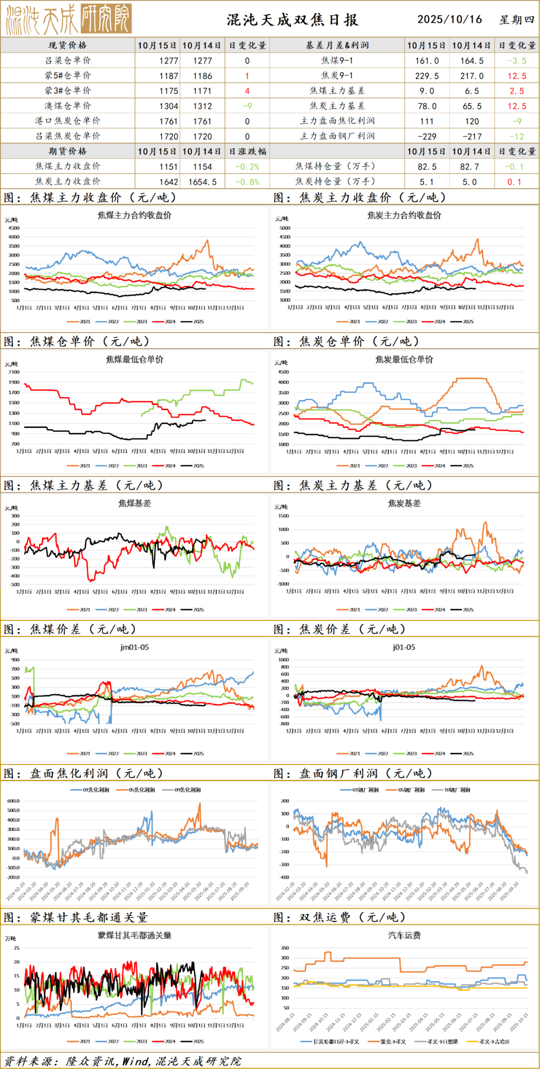 2.中国煤炭资源网冶金部10月15日重点关注:焦炭方面,金九银十已经过半,终端需求恢复仍较为缓慢,成材整体库存偏高,企业有一定销售压力,不过当前钢厂仍保有一定利润,铁水产量维持在较高水平,多数钢厂原料采购以按需为主,部分库存偏低或结构不合理的企业存在催货行为,影响焦企出货顺畅,场内多保持低库存运行,另外,节后部分原料煤价格再次探涨,成本进一步得到支撑。整体来看,焦炭自身供需矛盾不突出,后期需关注原料煤价格走势及铁水产量情况。焦煤方面,产地供应逐步恢复,除个别煤矿因井下原因产量受限,其余煤矿多开工正常。下游焦企多数按需补库,中间环节适当采购,焦煤市场成交氛围较好,近两日竞拍成交涨多跌少,坑口个别报价小幅有涨。目前煤矿基本无库存压力,多数报价以稳为主,焦钢企业开工高位下短期刚需仍有支撑。进口蒙煤方面,昨日甘其毛都口岸通关恢复正常,通关1262车,另外受今日会议影响,监管区昨日下午暂停外调。近日口岸可售现货较少,贸易商报价高位,蒙5原煤昨日部分成交涨至1040-1045元/吨左右。