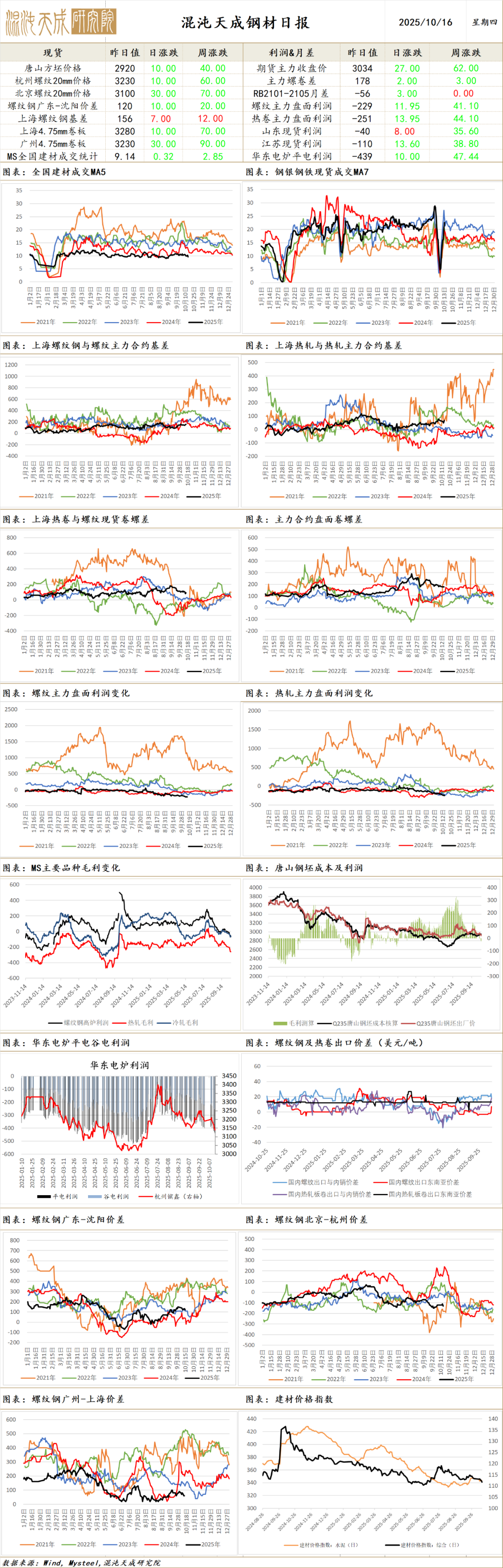 需求端,昨日找钢数据显示钢材厂库、社库延续增长,但总库存增幅有所放缓,而钢材表需有明显回升。另据百年建筑调研,本周全国水泥出库量252.85万吨,环比上升7.7%,基建水泥直供量环比上升4%;混凝土发运量为149.68万方,环比增加3.04%;样本建筑工地资金到位率59.44%,周环比减0.1个点,显示当前建筑下游需求依然喜忧参半。海外方面,假期美政府停摆,美债规模继续上升,美元信用减弱,叠加当前中美贸易博弈不确定性增大,近日贵金属及有色等外盘商品走势大幅波动。国内方面,近日发改委印发《节能降碳中央预算内投资专项管理办法》,支持钢铁等行业节能降碳改造,国内政策预期依然向好,但受中美博弈升级影响,短期国内商品氛围依然偏弱。进出口方面,昨日国外主要地区钢价普遍持稳,目前国内外冷热卷价差变动不大,国内钢材仍有一定出口空间。
