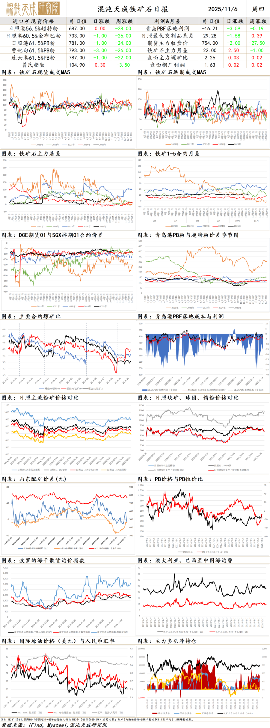 5.11月5日远期现货市场活跃度多集中在一级市场,公开平台上连续三日有卡粉报盘出现,均未成交。矿山私下议标较为活跃,有PB粉、印粉、P2FG、LONS、SFMU以及Assmang粉等资源的动态。二级市场上卖家报盘较为积极,买家询盘活跃度一般,多关注中品资源以及精粉资源。港口现货市场活跃度较昨日明显转弱,主流品种价格小幅下跌,高品粉矿跌幅则更为明显。
