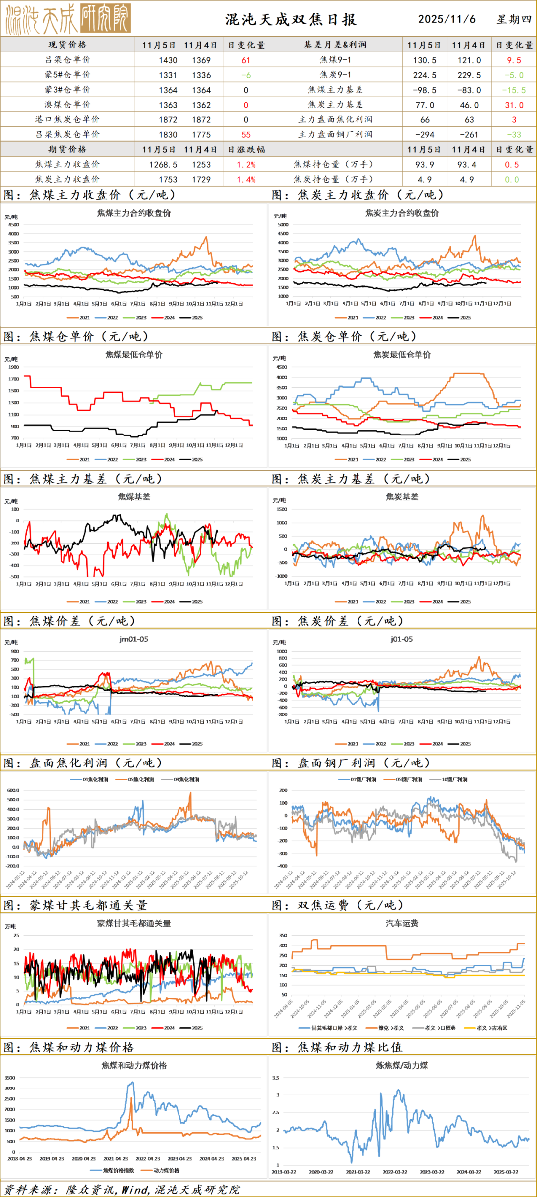 1.焦炭第三轮提涨落地。11月5日河北市场钢厂对焦炭采购价上调50/55元/吨,调整后:一级湿熄焦(A≤12.5,S≤0.7,CSR≥65,MT≤7),报1710元/吨;一级干熄焦(A≤12.5,S≤0.7,CSR≥65,MT≤0),报2085元/吨(顶装焦);以上均为到厂承兑含税价,5日0时起执行。