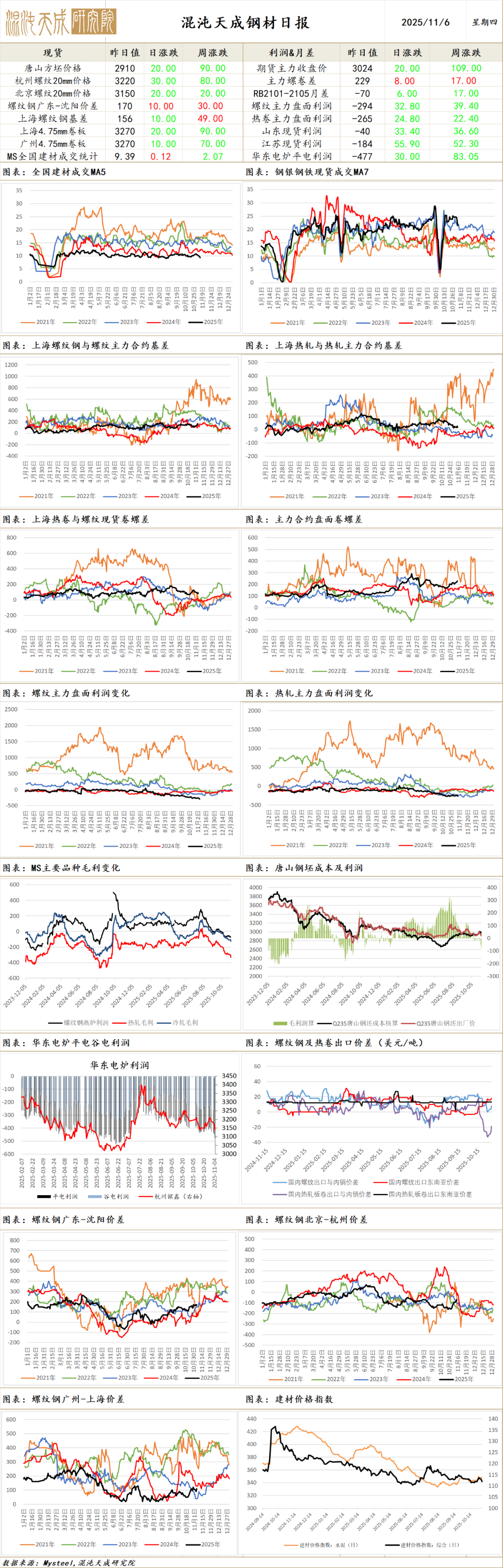 需求端,周一钢银城市钢材库存继续下降,各品种库存均有不同程度减量。昨日找钢及钢谷数据显示钢材厂库、社库延续下降,但总库存降幅趋缓,钢材表需均有不同程度回落。另据百年建筑调研,本周全国水泥出库量284.9万吨,环比上升0.8%,基建水泥直供量环比上升0.6%;混凝土发运量为155.84万方,环比减少2.48%;样本建筑工地资金到位率59.82%,周环比上升0.12个百分点,显示近期建筑下游需求喜忧参半。海外方面,当前美国政府停摆延续,但美联储10月如期降息25BP,随着中美领导会面宏观利好兑现,叠加近期海外流动性担忧趋增,外盘商品波动增大。国内方面,尽管10月制造业PMI表现不及预期,但近期国内货币及财政政策均有向好预期,国内宏观氛围依然偏暖。进出口方面,昨日欧盟钢价小幅回落,国外其它地区钢价依然持稳,目前国内外冷热卷价差变动不大,国内钢材仍有部分出口空间。