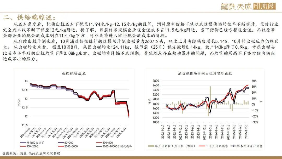 从后续出栏计划来看,10月涌益数据统计的规模场计划出栏量为2607万头,环比上月实际销售增长5.14%,10月的出栏压力仍然巨大。从出栏均重来看, 截至10月8日集团出栏均重124.11kg,较节前(9月25日)稳定微增0.14kg,散户143kg降了0.9kg,考虑出栏占比及市占率后的出栏均重下降0.08kg左右,出栏均重降幅不及预期,养殖端或存在被动累库的问题,而均重的居高不下亦对猪肉供应造成不小的压力。