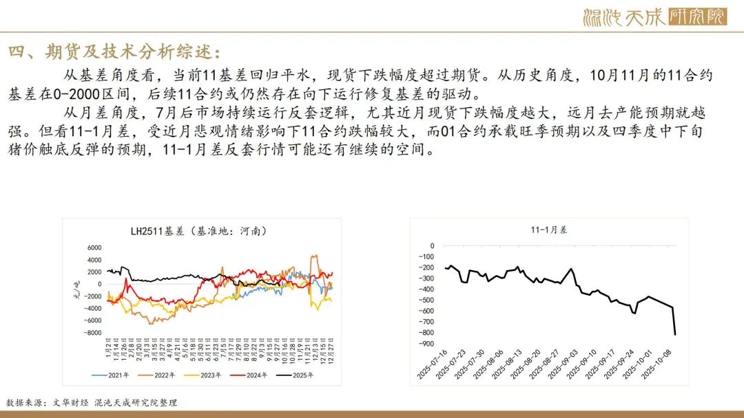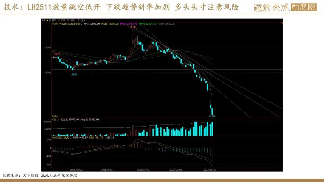 策略及技术建议:单边:LH2511空单、LH2503空单继续持有,等待现货近期有企稳迹象后止盈。
