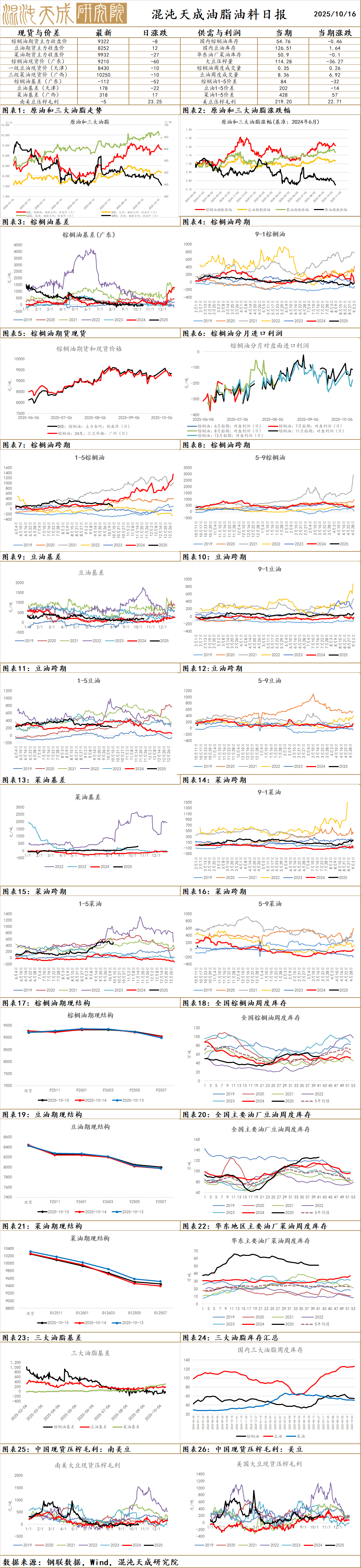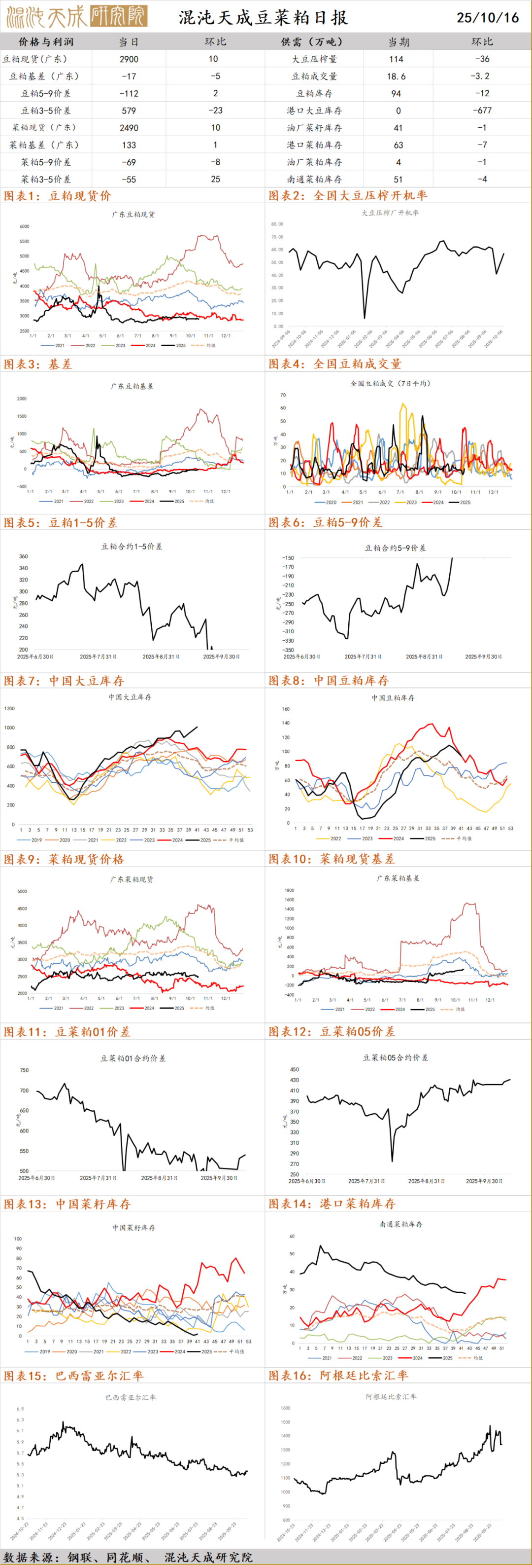 供给端:加拿大外长阿南德定于10月16日至17日访华;北方新季菜籽正集中上市,市场供应增加对价格形成一定压力;澳大利亚24/25菜籽旧作产量由6月份的610万吨上调至640万吨,25/26新作产量由6月份的571万吨上调至645万吨;商务部公告2025年第45号公告延长对原产于加拿大的进口油菜籽反倾销调查期限至2026年3月;中国与澳大利亚签署关于实施和审议中澳自贸协定的谅解备忘录,对远月供应紧张预期有所改善。