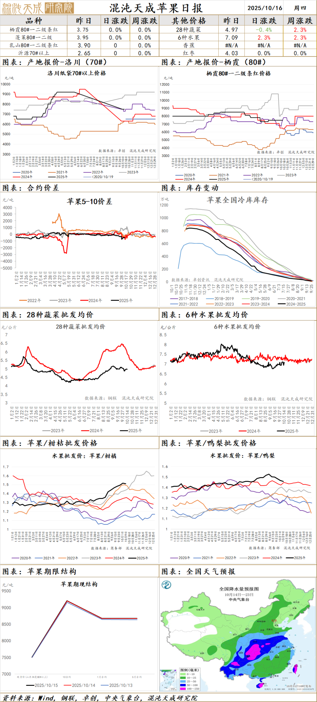 苹果:山东产区库存苹果行情平稳,冷库货源成交比较少,主要有补货需求的客商采购,受天气影响,新季晚熟富士尚未大量供应,近期降雨上色偏慢,上市时间推迟10天左右;陕西产区红货较少,尚未装货,仅有部分客商开始订购质量较好的果园,洛川产区近期70#起步主流订货价格3.5-4.0元/斤,好货4.0-4.5元/斤,以质论价;产地收购期缩短,收购氛围浓厚,天气影响仍存,霜降强偏强,后期关注收购价格的变动和入库情况。