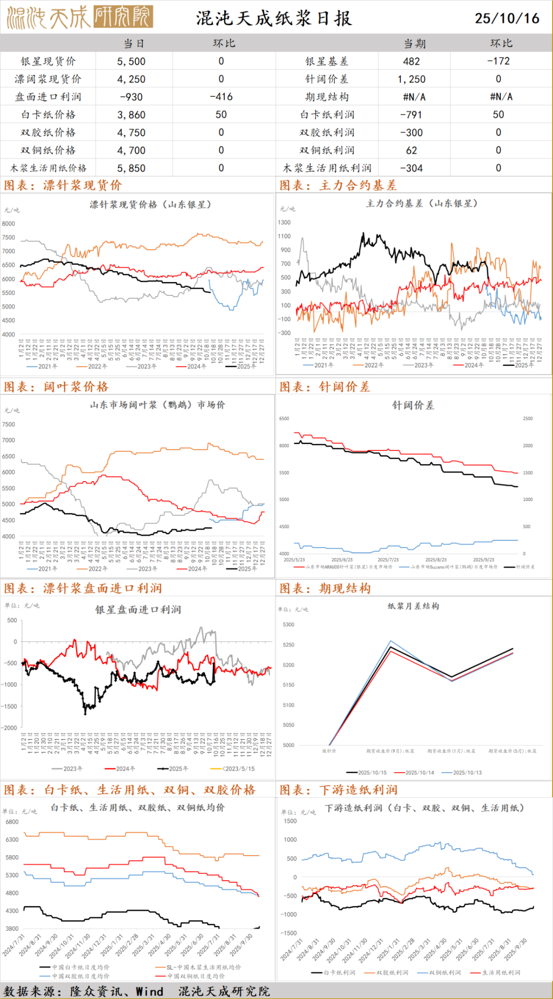 纸浆:昨日国内针叶浆现货稳定,银星5500元/吨(0),俄针5000元/吨(0);阔叶浆现货稳定,金鱼4250元/吨(0);针阔叶浆价差1250元/吨(0),现货市场交投一般;白卡纸市场,大厂产销平衡,保持涨价态度;生活用纸市场价格区间盘整,场内整体交投活跃度变化不大,市场观望情绪较浓;文化用纸市场,行业货源供应充裕,下游消费未见明显提振;受海外浆厂减产传闻影响,盘面出现反弹;行业基本面没有明显改观,整体旺季不旺,上方有一定压力,下方有成本支撑,关注重要纸厂停产情况和政策影响持续性。