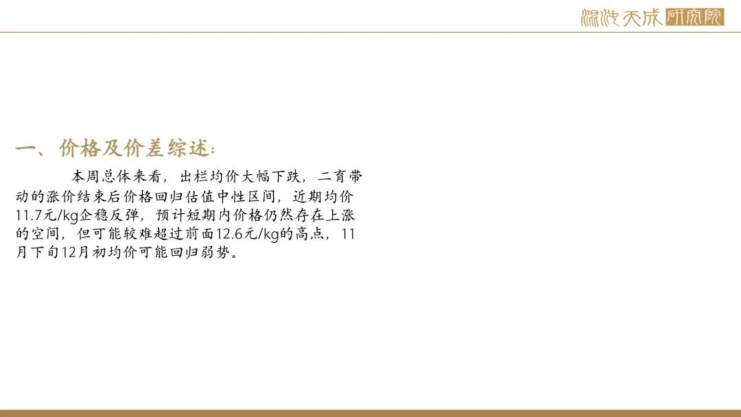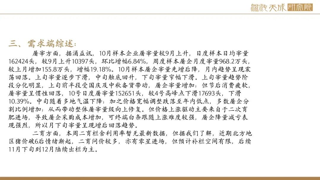二育方面,本周二育栏舍利用率暂无最新数据,但据我们了解,近期北方地区猪价破6后情绪渐起,二育问价较多,亦有零星进场,但预计补栏空间有限,后续11月下旬到12月陆续出栏为主。