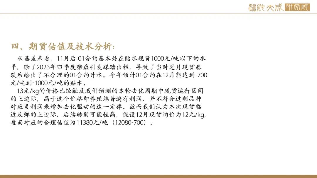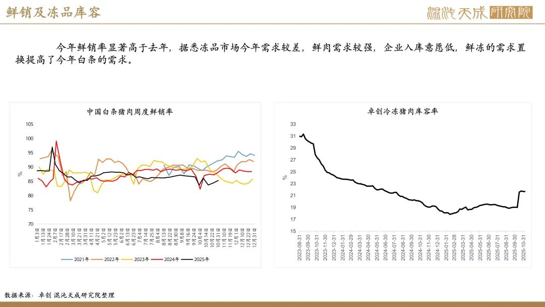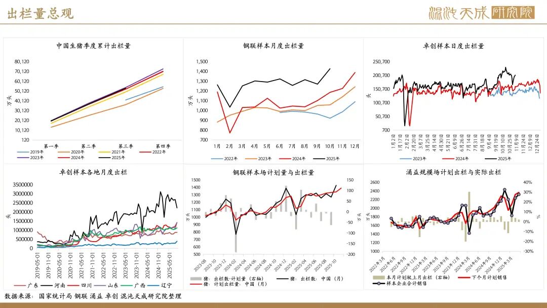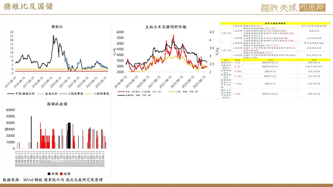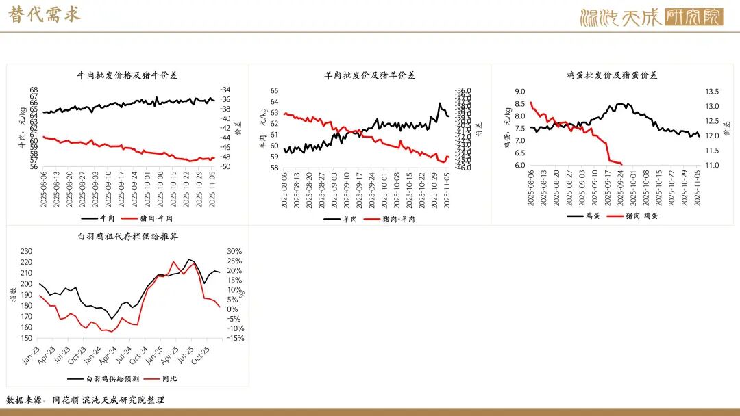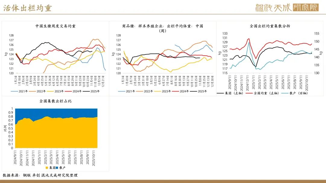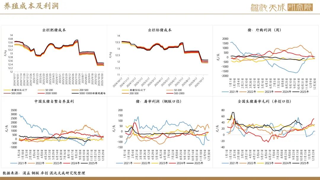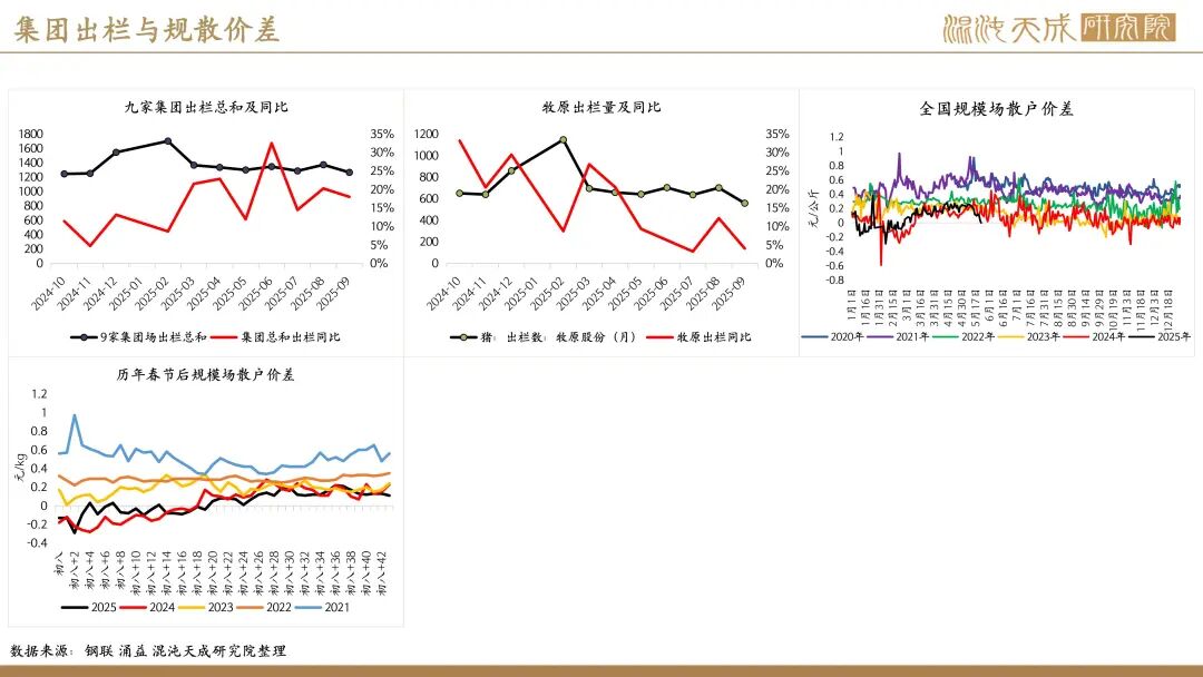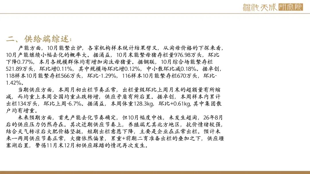 未来预期方面,首先产能去化节奏确定,但10月幅度中性,未发生超淘,26年8月后的供应压力仍然存在。其次近期供应节奏上,养殖端尤其北方地区,抗价情绪较强,结合天气转凉后大肥价格坚挺,短期出栏意愿下降,主要是企业在正常出栏。预计未来一两周供应节奏正常,大猪依然偏紧,累重+前期二育准备出栏的叠加之下,供应堰塞湖后置,警惕11月末12月初供应踩踏的情况再次发生。