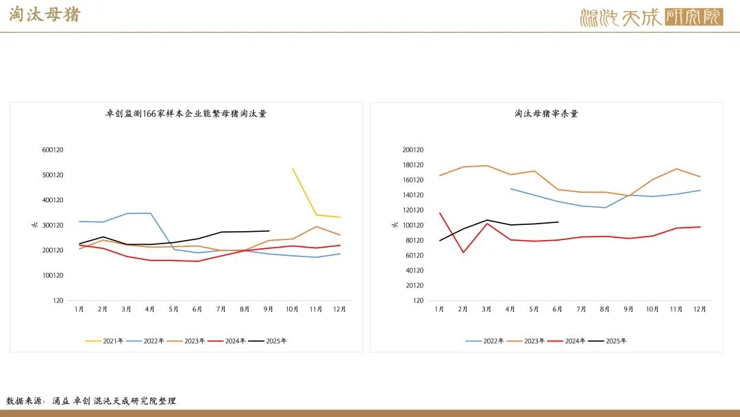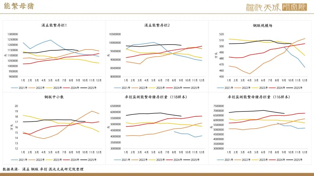 产能方面,10月能繁出炉,各家机构样本统计结果劈叉,从淘母价格的下探来看,10月产能继续小幅去化的概率大。据涌益,10月末能繁母猪存栏量976.98万头,环比下降0.77%,本月各规模群体均有增加淘汰母猪量。据钢联,10月综合场能繁存栏521.89万头,环比增0.11%,其中规模场环比增0.12%,中小散环比减0.18%。据卓创,118样本10月能繁存栏566万头,环比-1.29%,116样本10月能繁存栏670万头,环比-1.42%。