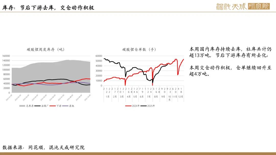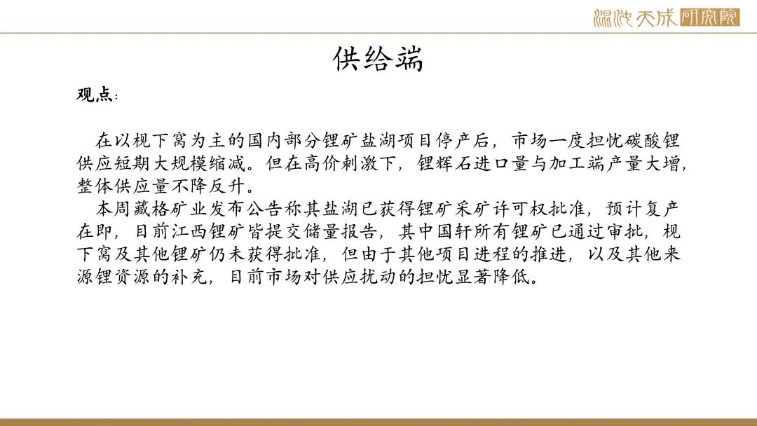 供给:本周藏格矿业发布公告称其盐湖已获得锂矿采矿许可权批准,预计复产在即。目前江西锂矿皆提交储量报告,其中国轩所有锂矿已通过审批,枧下窝及其他锂矿仍未获得批准,但由于其他项目进程的推进,以及其他来源锂资源的补充,目前市场对供应扰动的担忧显著降低。