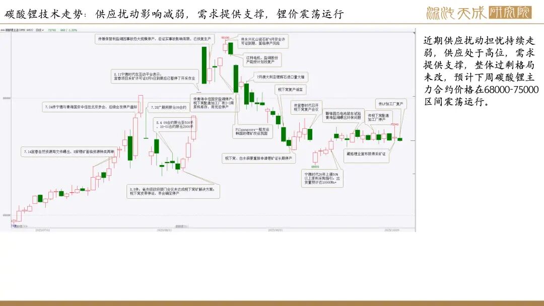 结论:近期市场供应扰动的影响在总供应量维持高位,部分项目取得相关批准的情况下逐渐减弱,而另一方面,由于储能电池订单爆满,动力电池需求维持高位,当前碳酸锂需求端整体表现强劲,库存维持持续降低趋势。整体来看,目前碳酸锂处于供需双强的格局。