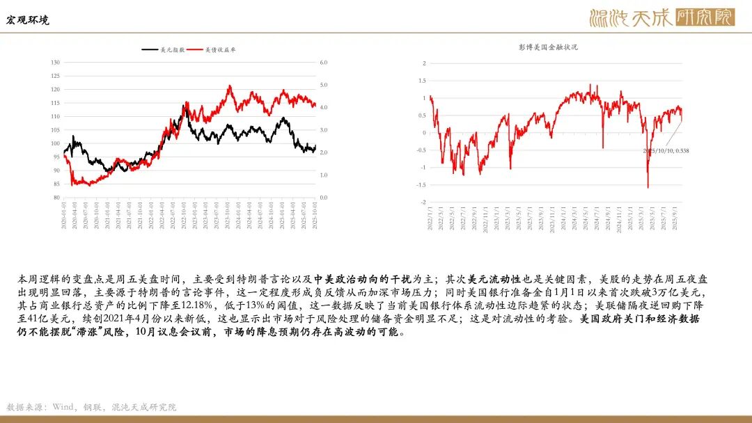 海外宏观:本周逻辑的变盘点是周五美盘时间,主要受到特朗普言论以及中美政治动向的干扰为主;其次美元流动性也是关键因素,美股的走势在周五夜盘出现明显回落,主要源于特朗普的言论事件,这一定程度形成负反馈从而加深市场压力;同时美国银行准备金自1月1日以来首次跌破3万亿美元,其占商业银行总资产的比例下降至12.18%,低于13%的阈值,这一数据反映了当前美国银行体系流动性边际趋紧的状态;美联储隔夜逆回购下降至41亿美元,续创2021年4月份以来新低,这也显示出市场对于风险处理的储备资金明显不足;这是对流动性的考验。美国政府关门和经济数据仍不能摆脱“滞涨”风险,10月议息会议前,市场的降息预期仍存在高波动的可能。