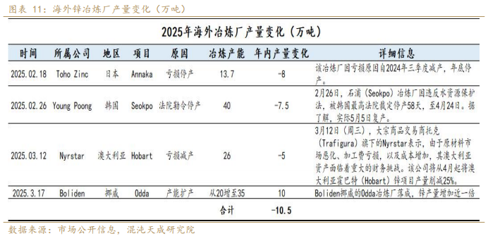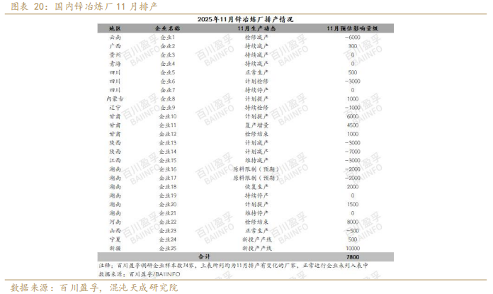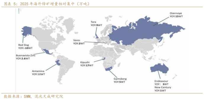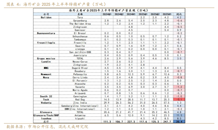 根据国际铅锌小组数据,2025年1-7月,全球锌精矿产量719.9万吨,同比增6%(上半年+40.8万吨),其中国内锌矿1-7月234万吨(同比+10.9万吨),同比增4.9%,海外锌矿1-7月485.9万吨(同比+29.9万吨),同比增6.6%。从我们定期跟踪的海外各大矿山公布的季报来看,2025年上半年产量同比有20.4万吨的增量,Antamina、Tara、Kipushi、Tara、OZ、Gamsberg等矿增产顺利,2025年海外锌矿在复产+新投带动下同比高增,对比我们2025年年报给出的全年新增锌矿65万吨,今年全球矿端的增量是在逐步兑现的。
