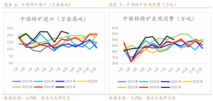 全球矿端今年的增量相对集中,且贸易流向多数流向国内,根据中国海关数据,2025年1-8月我国进口锌精矿159.4万吨,同比增43.1%(上半年+37.5万吨),海外上半年锌矿增量约在25万吨,忽略运输时长,海外矿端除去出口到国内的供应同比非增反减。而国内锌矿供应(产量+进口)大幅增加,锌冶炼厂原料库存天数上行至同期高位,2025年1-8月国内锌精矿表观消费378.5万吨,同比大增9.9%。而海外矿端的供应相对不及国内富余。