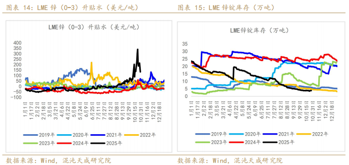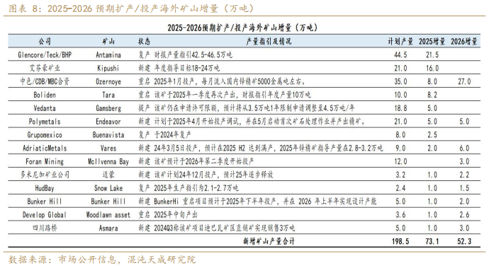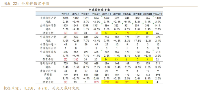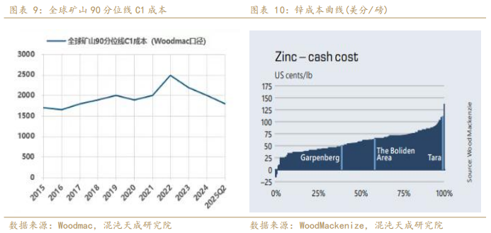 全球锌矿端的增量是有持续性的。根据S&P全球铅锌矿勘探投资来看,2020-2022年期间是维持低速正增长的,同时从Woodmac给出的全球矿山90分位线C1成本从2022年开始是持续下行的,现在的lme锌价(3000美金)基本给了99%的矿山利润,所以复产和新投的供应增量是有持续性的,2025年我们认为全球锌矿增量约在70万吨,2026年仍将保持约4%的供应增速。