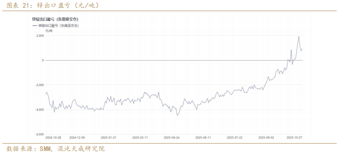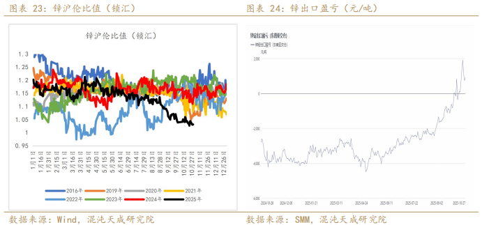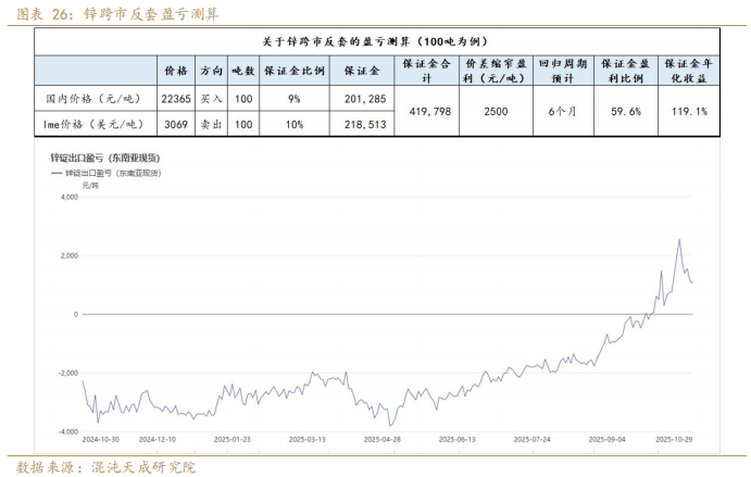 锌作为一个全球流通的商品,内外价格的联动是非常紧密的,所以LME锌和沪锌历史价格走势基本是一致的,自2025年4月特朗普上台拟对全球施加对等关税以来,沪锌价格走势整体呈现出宽幅震荡,而lme锌价格却在不断的上行,导致内外价差不断的走阔。我们在2025年6月的有色专题中基于全球矿端供应增量兑现,认为锌是一个等待做空的标的,却迟迟未等来下跌的进场信号,随着内外价差走阔到给出国内锌出口利润的当下,我们认为内外比价修复(多国内空海外)的时点已经到来。