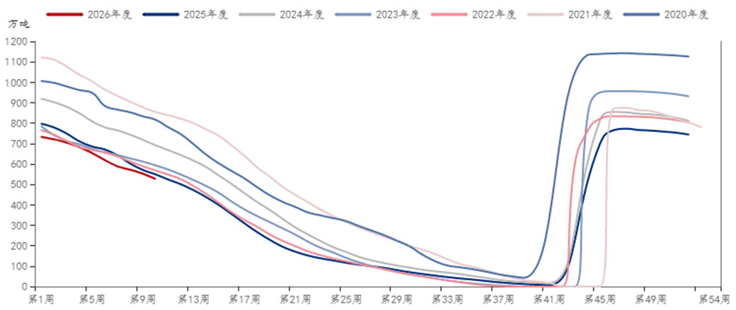 根据成熟期的不同,苹果可分为早熟、中熟和晚熟三类:早熟品种于7月至8月上旬成熟,中熟品种在8月至9月成熟,晚熟品种则要到10月以后才上市。在耐藏性上,晚熟品种最耐储存。苹果在采摘后进行入库冷藏处理,晚熟品种如“国光”“青香蕉”“红富士”等贮藏期在六七个月。当下的时间节点,市场供给主要来自冷库存量。钢联数据显示,截至2026年第10周我国苹果冷库库存为527.53万吨,环比减少25.39万吨,降幅4.59%;同比减少21.7万吨,降幅3.95%,库存创近7年来的新低。