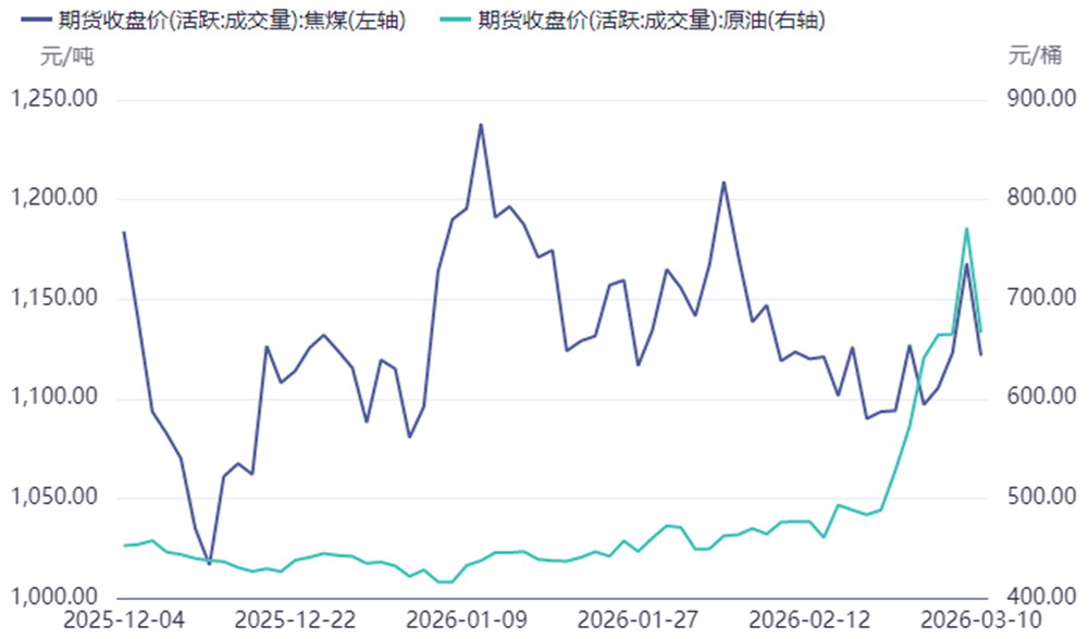 本周,中东地缘局势引发国际能源市场巨震。3月9日,原油价格受地缘局势紧张影响大幅走高,能源板块的整体拉升带动市场情绪外溢至煤炭板块。国内煤炭股票在股市偏弱的状态下逆势上涨,焦煤价格也大幅上行。当日焦煤主力合约开盘报1136元/吨,收盘报1168元/吨,最高触及1195.5元/吨涨停价,持仓量为42.15万手,成交量为136.97万手。3月10日,中东地缘局势缓和的消息传出,国际原油价格率先大幅调整,焦煤期货的地缘溢价随之快速回吐。作为全球定价的核心能源,原油价格的剧烈波动往往会在短期内改变市场对大宗商品的整体定价框架。当原油价格快速上涨时,市场往往会强化“能源通胀”的交易逻辑,将煤炭纳入能源资产进行统一定价,从而推动相关商品期货走强。但从实际产业结构看,焦煤价格的核心决定因素仍然是钢铁行业需求、焦化企业利润以及煤矿供应情况,这些基本面变量在短期内并未因为原油价格上涨而发生明显改变。