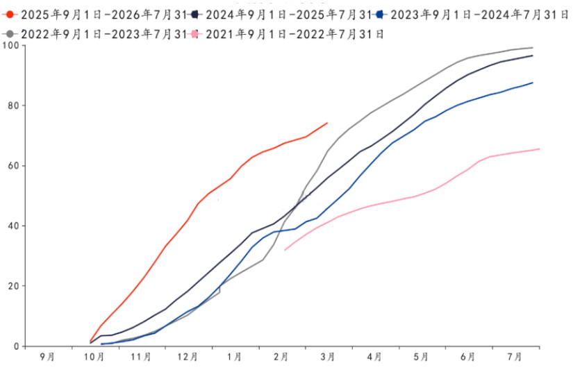 2025/2026年度国内棉花产量大幅增加,棉花消费同样表现强劲。开秤初期新棉大量预售,叠加国内纺织产能扩张,带动年度消费有所提升,市场普遍存在商业库存偏紧预期。截至3月15日,全国棉花商业库存为523.02万吨,较2月底减少24.68万吨,同比增加5.31万吨;其中新疆疆内棉花库存为388.5万吨,较2月底减少18.7万吨,同比减少12.91万吨。与2月底相比,全国商业库存由同比偏低转为略偏高,但新疆棉花库存同比仍偏低。近年新疆纺织产能增长较快,疆内棉花消费量持续提升,当前棉花库存偏紧预期依然存在,但短期对棉价的提振作用需谨慎看待。
