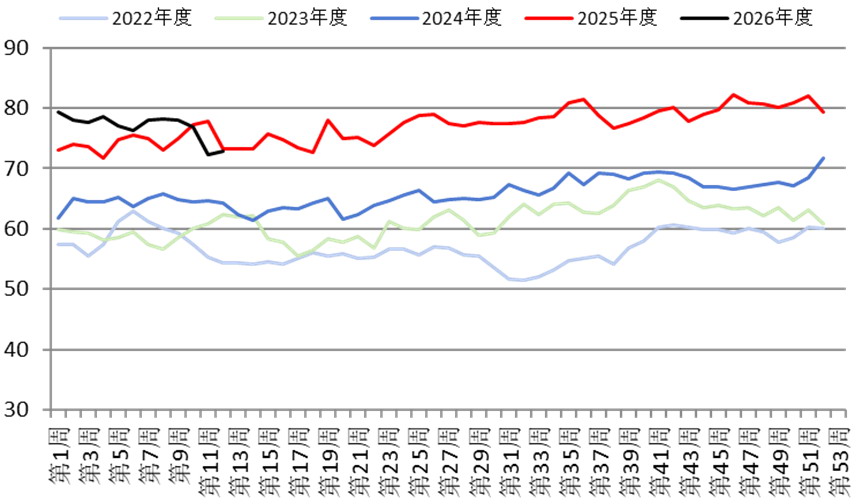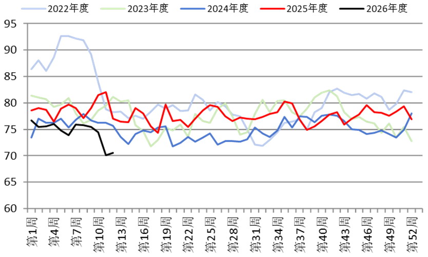 国内聚丙烯生产企业面临较大的成本压力,且原料供应存在较大的不确定性,装置降负情况有所增加,产能损失量大幅上升。根据隆众资讯统计,截至3月20日,行业平均产能利用率为70.50%,同比下降6.5个百分点,处于近年来低位。企业降负减产的情况预计会持续一段时间,油制聚丙烯装置停车、降负将在3月底逐步兑现,全国平均产能利用率或降至约68%。