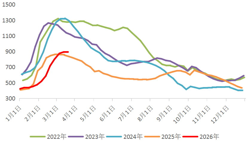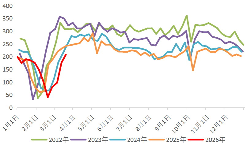 中东地缘冲突对螺纹钢价格产生短期扰动,在情绪退潮后,市场焦点或转向基本面。当前,“金三银四”传统旺季来临,需求处于回升通道。上周螺纹钢表观消费量为208.09万吨,周环比增加31.28万吨。根据百年建筑调研,截至3月18日,全国10692个工地开工率为62%,环比提升19.5个百分点。螺纹钢需求稳步释放,水平与去年农历同期相近。