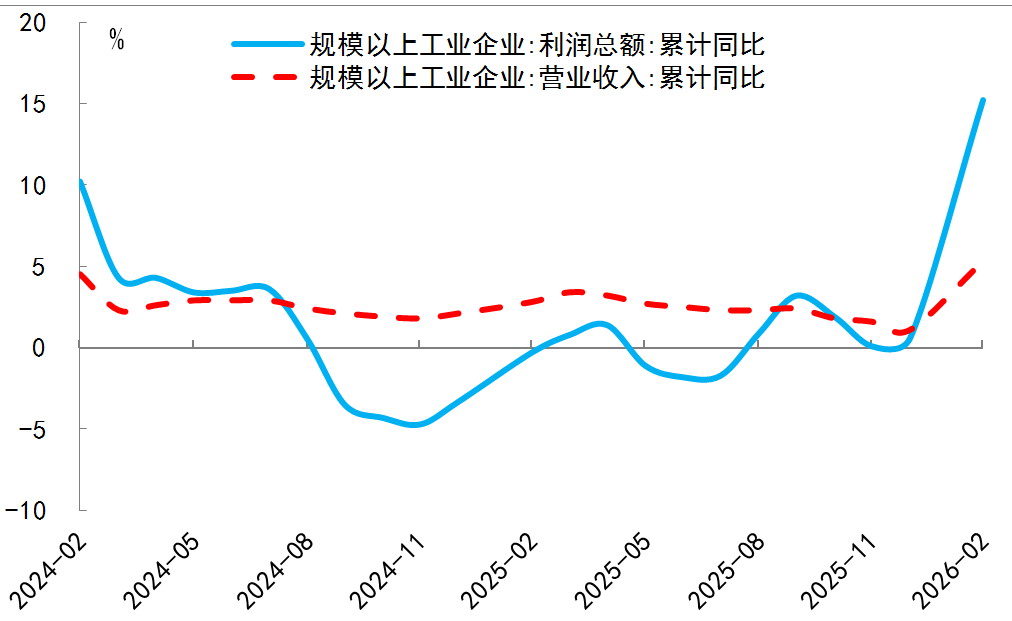 企业盈利呈现向好态势,1—2月规模以上工业企业利润同比增长15.2%,增速较去年全年提高14.6个百分点。核心驱动来自毛利改善,毛利润同比增长6.9%。1—2月营业收入同比增长5.3%,增速较去年全年提高4.2个百分点,市场需求与生产活动同步修复。拆分来看,量、价、利润率三因素均有所改善。量的方面,1—2月工业增加值同比增长6.3%,增速较去年全年提高0.4个百分点,生产端支撑作用增强。价的方面,1—2月PPI同比下降1.2%,降幅较去年全年收窄,价格拖累减轻。利润率方面,1—2月营收利润率为4.92%,同比提高0.43个百分点。同比增速转正主要得益于成本下降。每百元营业收入的成本为84.83元,同比下降0.24元,为2022年以来首次同比下降。
