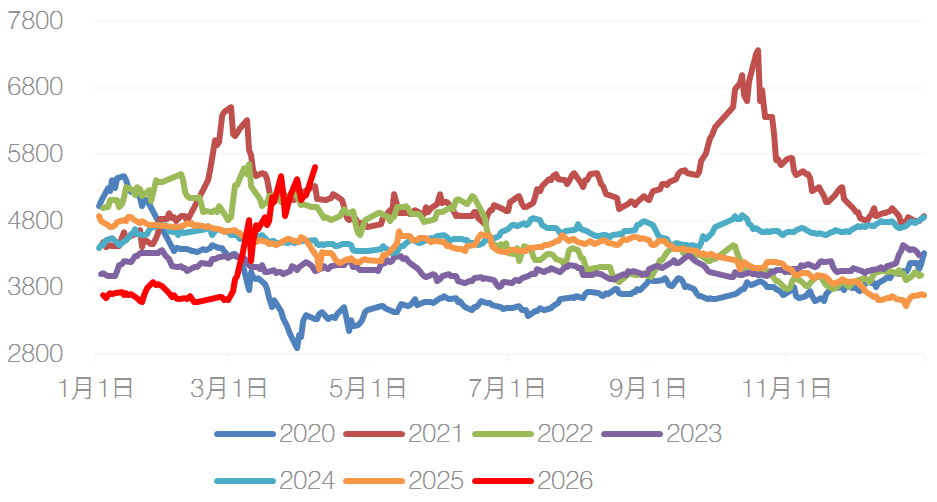 自3月以来,受中东地缘冲突持续升级、霍尔木兹海峡航运受阻、中东地区大型石化综合设施遇袭等因素影响,乙二醇期货价格大幅上涨,近一个月从3700元/吨涨至5700元/吨,创下4年来新高。4月7日,沙特朱拜勒工业区遭遇大范围袭击,乙二醇期货价格再度涨停。