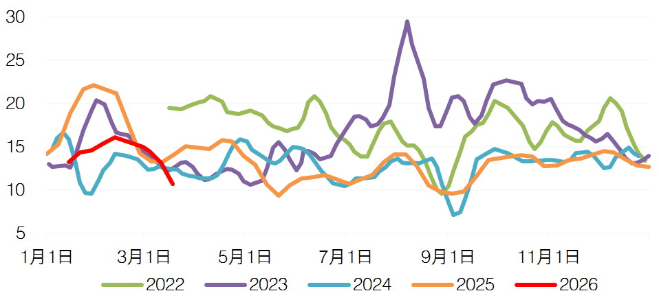 图为国内乙二醇周度到港量(单位:万吨)