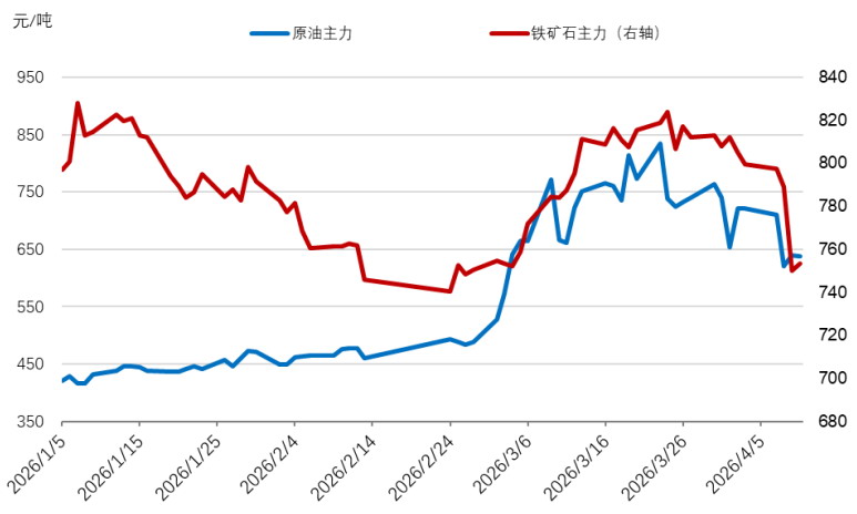 图为今年以来国内原油与铁矿石主力合约价格走势