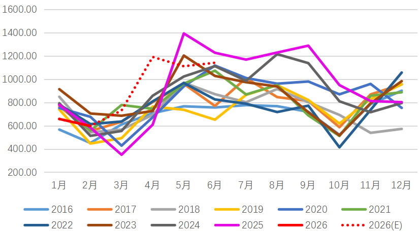 总体来看,近期豆一期货价格拉涨对市场形成明显支撑,但现货市场价格整体表现平稳,跟涨幅度有限。销区虽出现阶段性需求升温迹象,但多为刚需补库,实际消费并未明显好转,整体需求依旧低迷。在供应相对宽松、下游采购谨慎的背景下,价格缺乏持续上涨动力。不过,受今年包地成本及化肥等农资价格上涨影响,豆一价格有望维持震荡偏强态势。建议关注中东局势的进展,以及特朗普5月中旬访华能否推动贸易协定取得重大进展。持粮贸易企业可考虑在价格高位适度出货,下游企业可关注盘面接货机会,个人投资者则需谨慎追高。(作者单位:徽商期货)