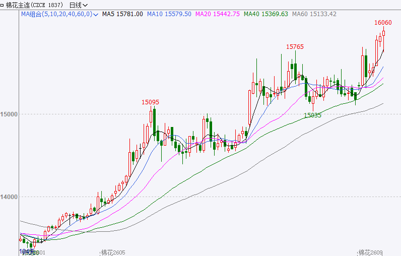 走势分析:今日行情小幅回调后继续创出新高,棉花供应从宽松转向紧平衡,后续有望震荡偏强运行,下方支撑位参考15650附近,上方压力位参考16300附近。