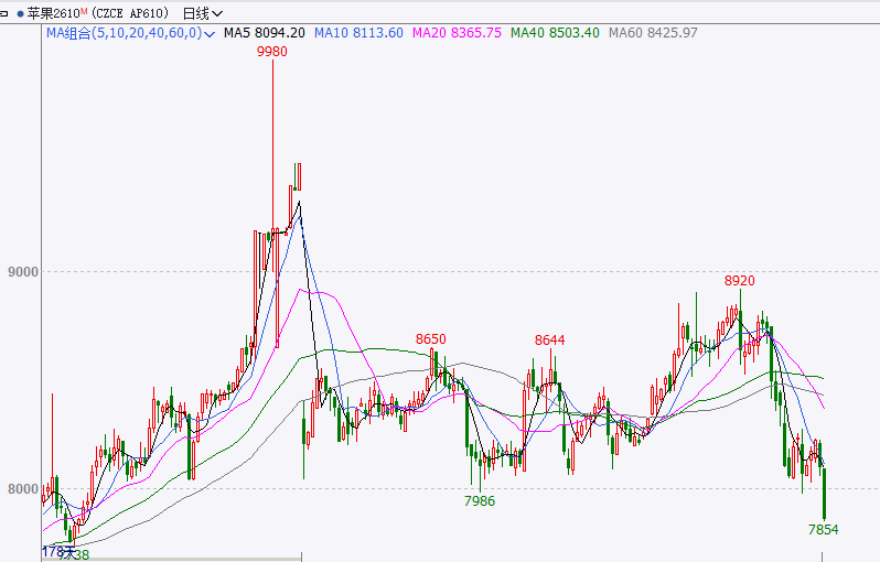 截至前一个交易日收盘,苹果主力合约震荡下行,收中阴K线。
