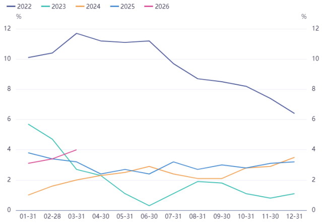 其次,美国PPI数据不及预期,涨幅小于市场预期。最新数据显示,美国3月PPI同比上涨4%,为2023年2月以来最高水平,但显著低于市场预期的4.6%;环比上涨0.5%,同样大幅低于预期的上涨1.2%,前值为上涨0.7%。核心PPI表现同样温和。剔除食品和能源的核心PPI环比仅上涨0.1%,远低于预期的0.5%及前值0.5%;同比上涨3.8%,较前值3.9%小幅回落。这一数据一定程度上提振市场情绪,此前大幅下修的降息预期迎来阶段性回暖,贵金属市场受此提振再度走强。但不容忽视的是,3月PPI数据可能仅反映了中东地缘冲突的初步影响,后续物价上涨会逐步传导至服装等消费品。