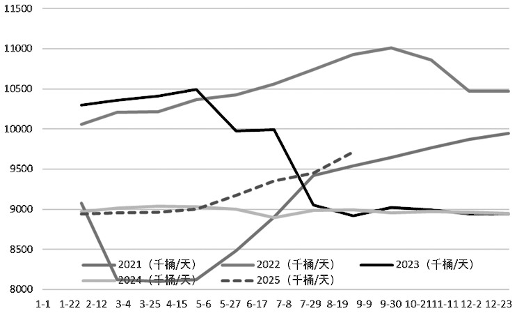 三季度,美国原油产量出现小幅下降。EIA发布的数据显示,7—8月,美国原油平均产量为1337万桶/日,较二季度减少6万桶/日,不过较去年三季度仍增加了7万桶/日。然而,进入9月后,产量先行指标释放出了积极信号。贝克休斯的数据显示,截至9月19日,美国石油钻机数达到418座,且连续4周增加,为7月以来的最高水平,这使得市场对四季度美国原油供应增加的预期有所升温。EIA在9月报告中预测,2025年,美国原油产量将达到创纪录的1344万桶/日,高于此前预测的1341万桶/日,而2024年美国原油产量为1324万桶/日。