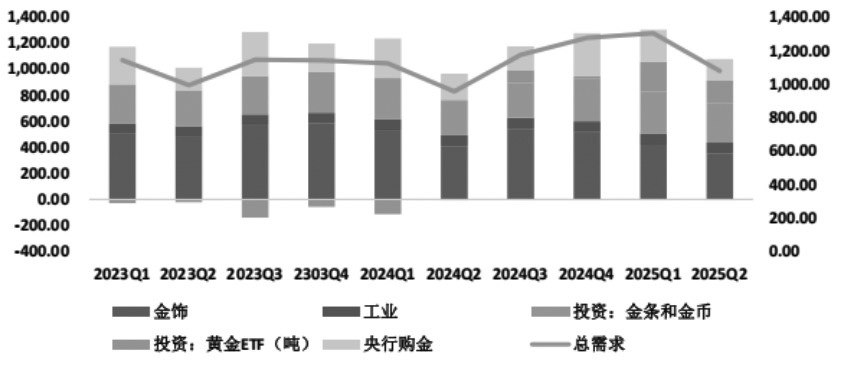 世界黄金协会公布的数据显示,2025年二季度,全球黄金总需求(含场外交易投资)同比增长3%,至1249吨。按价值计算,全球黄金总需求同比大幅跃升45%,达1320亿美元。各经济体央行依旧是全球黄金需求的关键支撑,二季度全球官方黄金储备总计增加166吨。虽然购金速度有所放缓,但央行购金需求的前景依旧乐观。这表明央行购金更多是出于长期的战略性考量,意在优化外汇储备结构,对冲全球经济与政治的不确定性,未来央行增持黄金仍是大势所趋。