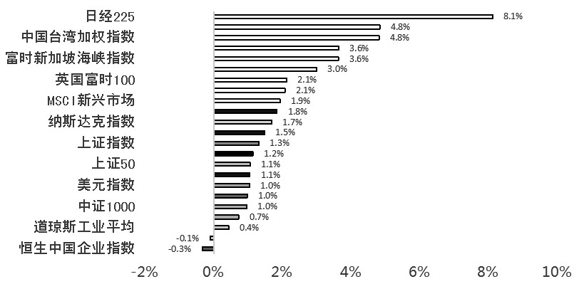 国庆中秋长假期间,海外市场整体以偏多为主。美国股市延续强势,科技板块成为核心引擎。10月6日,OpenAI与AMD达成战略合作协议,将在未来数年部署大规模的AMD GPU算力,AMD股价出现大幅上涨。在AI叙事和全球半导体行业复苏的推动下,港股半导体板块表现强劲。同时,受国际金价影响,黄金股大幅上涨。富时中国A50指数在长假期间同样表现活跃,整体呈现冲高态势。