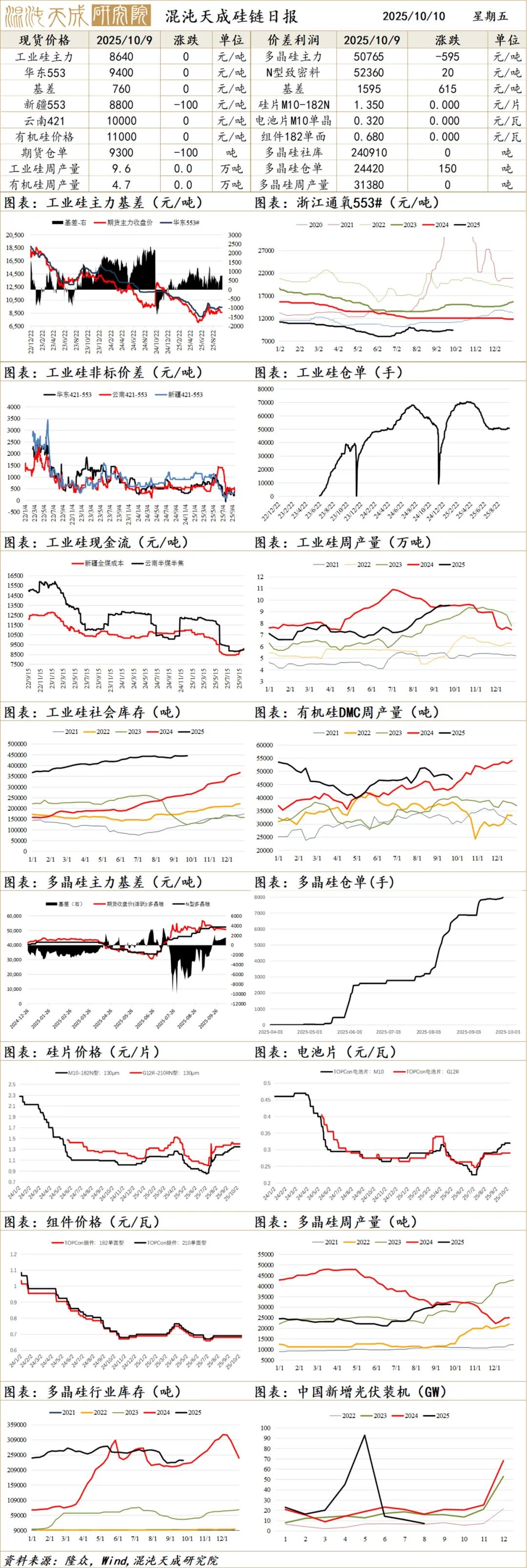 3、现实仍为高供应弱需求高库存,9月产量高位,10月产量有分歧;当前开工持稳,头部企业10月检修、提产不一致,仍有增量可能。下半年装机预期差,终端仍在探底,有负反馈压力。组件开始兑现降价预期。