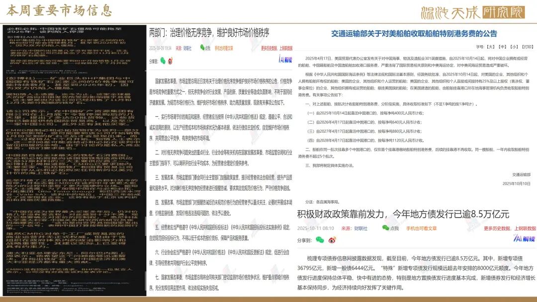 宏观:近日中国加大对重点商品的出口管制,周五交通运输部公告将对美船舶收取特别港务费,中美贸易博弈有进一步升级预期,短期可能对国内外商品形成较大利空。就国内宏观环境而言,发改委9日发布了关于治理价格无序竞争维护良好市场价格秩序的公告,最新数据显示今年地方债已发行逾8.5万亿元,显示当前国内政策依然积极向好。
