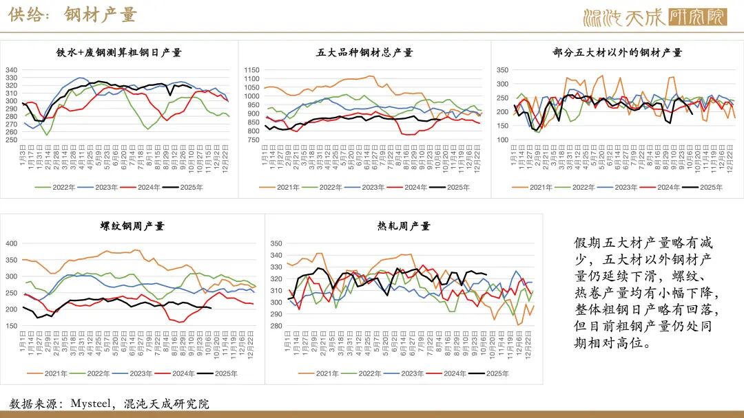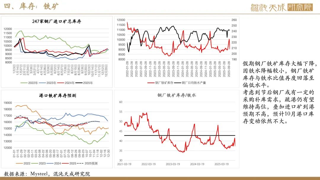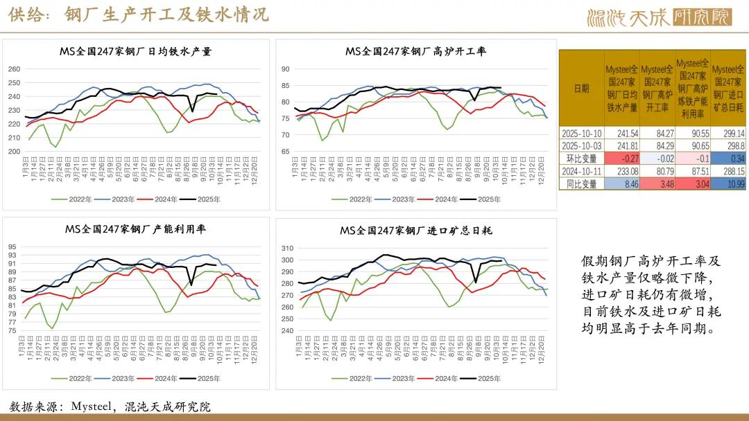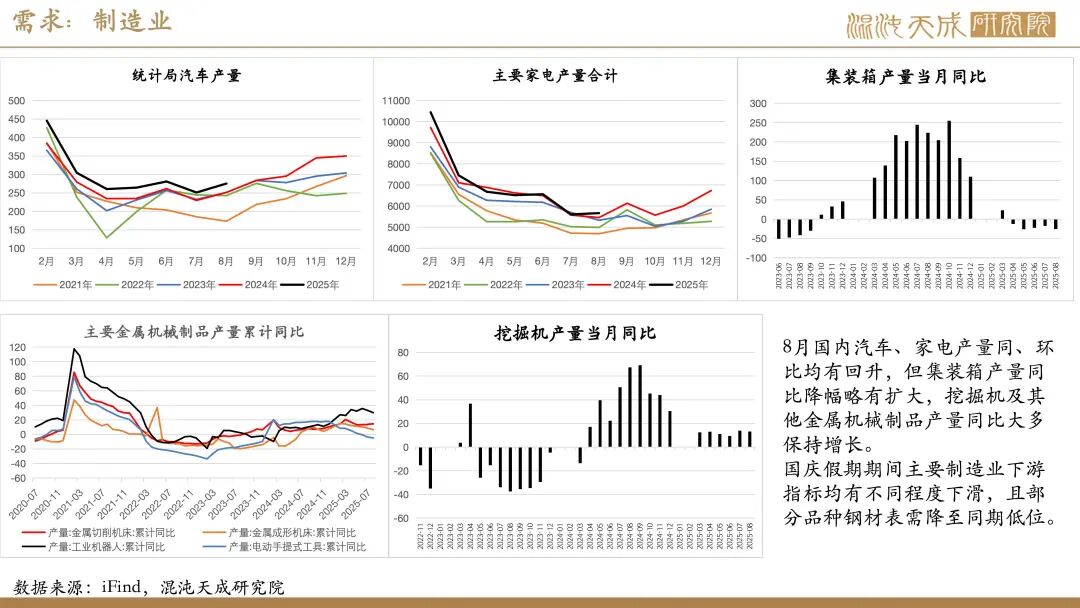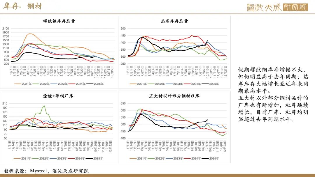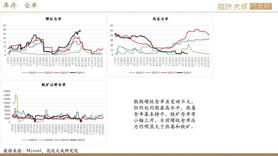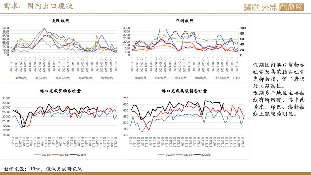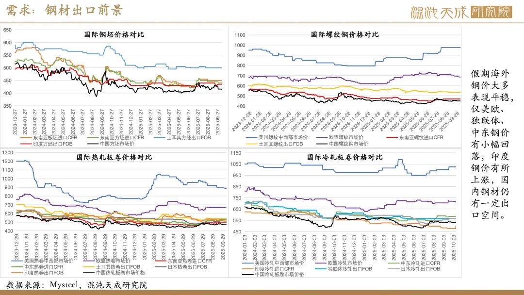 需求:受国庆假期影响,近期建筑业及制造业下游高频指标多有不同程度回落。不过,假期海外钢价大多表现平稳,仅美欧、独联体、中东钢价有小幅回落,印度钢价有所上涨,国内钢材仍有一定出口空间。此外,假期国内港口货物吞吐量及集装箱吞吐量仍处同期高位,叠加南美东、印巴、澳新等多个航线价格上涨,显示当前国内商品出口仍保持强劲。