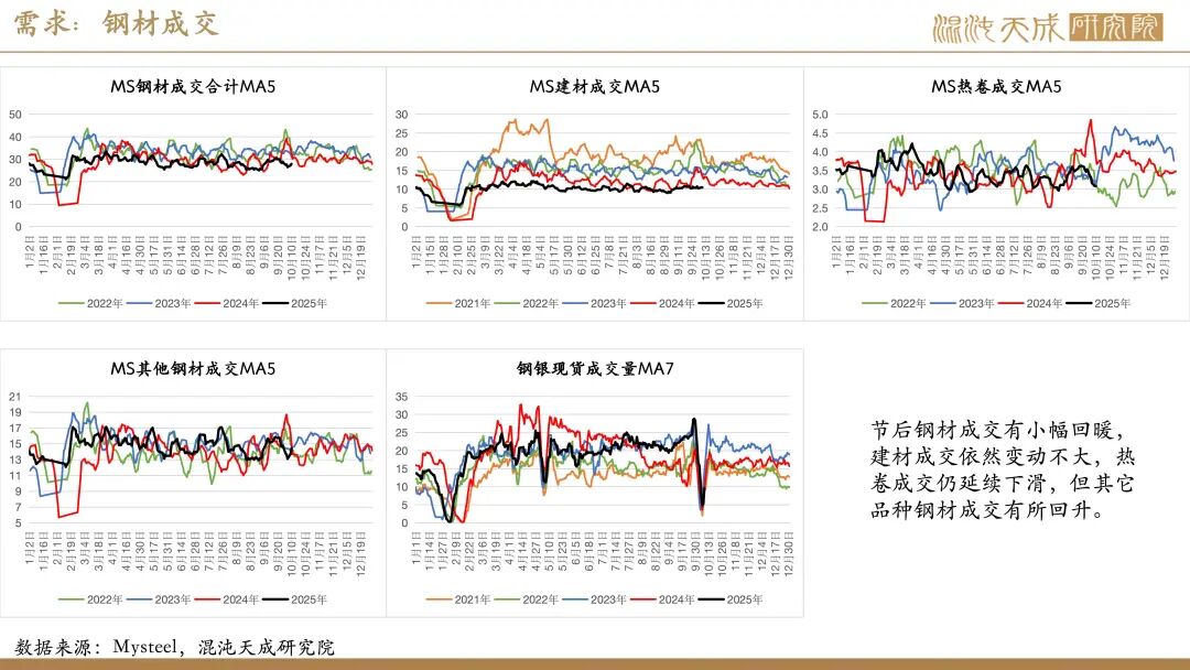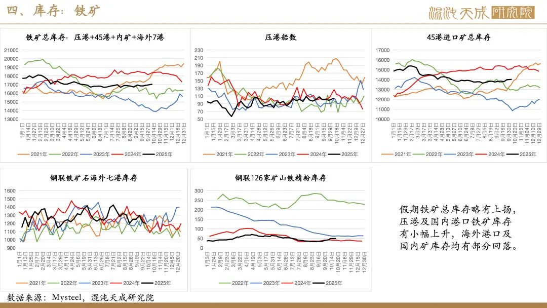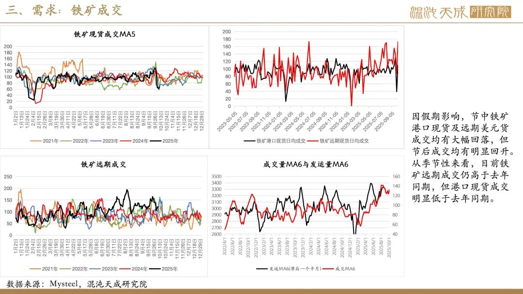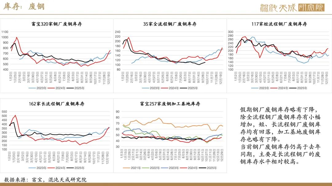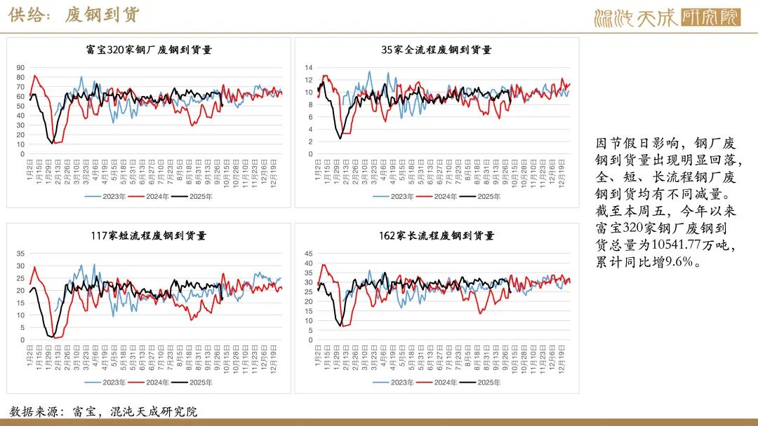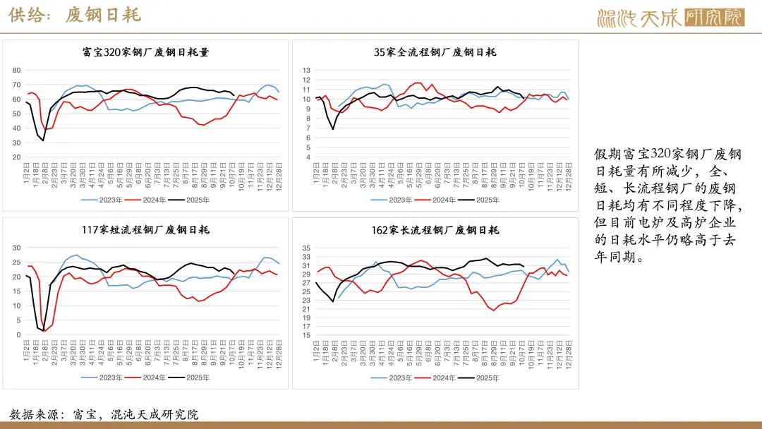 供给:假期全球铁矿发运有小幅回落,主要是澳洲及非主流发运减量,巴西发运略有回升,但因前期高发运,国内铁矿到港仍有增长。同期,国内矿产量变化不大,但废钢到货因假期影响有明显减少,整体铁元素供应略偏弱。由于废钢日耗及铁水均有减量,假期粗钢供应小幅减少。