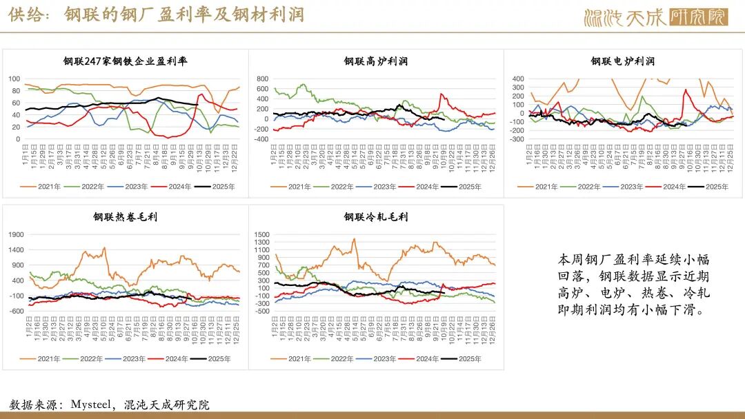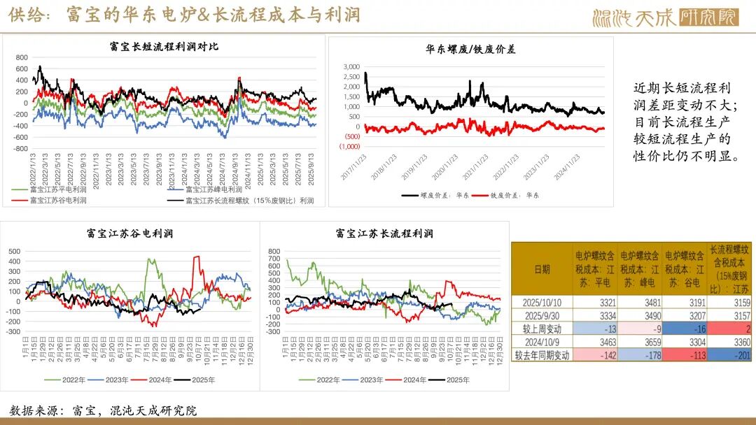利润&成本:钢厂盈利率继续小幅下降至56.28%,近期高炉、电炉、热卷、冷轧即期利润均有小幅下滑,富宝数据显示当前华东长流程含税成本在3159元/吨,电炉谷电成本在3191元/吨,平电成本在3321元/吨。